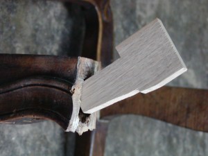Lorsque la cheville ne tient plus car le tenon a lâché, la seule et unique solution est de reconstituer le tenon par une pièce en queue d’aronde.
