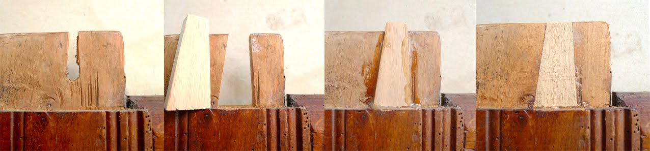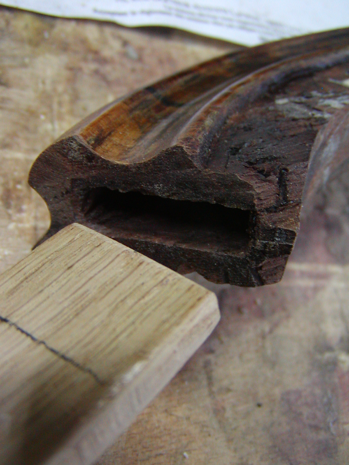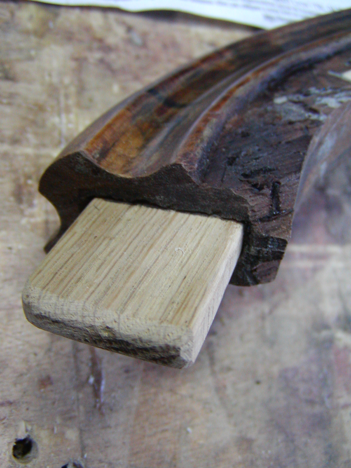 Lorsque la cheville ne tient plus car le tenon a lâché, la seule et unique solution est de reconstituer le tenon par une pièce en queue d’aronde.