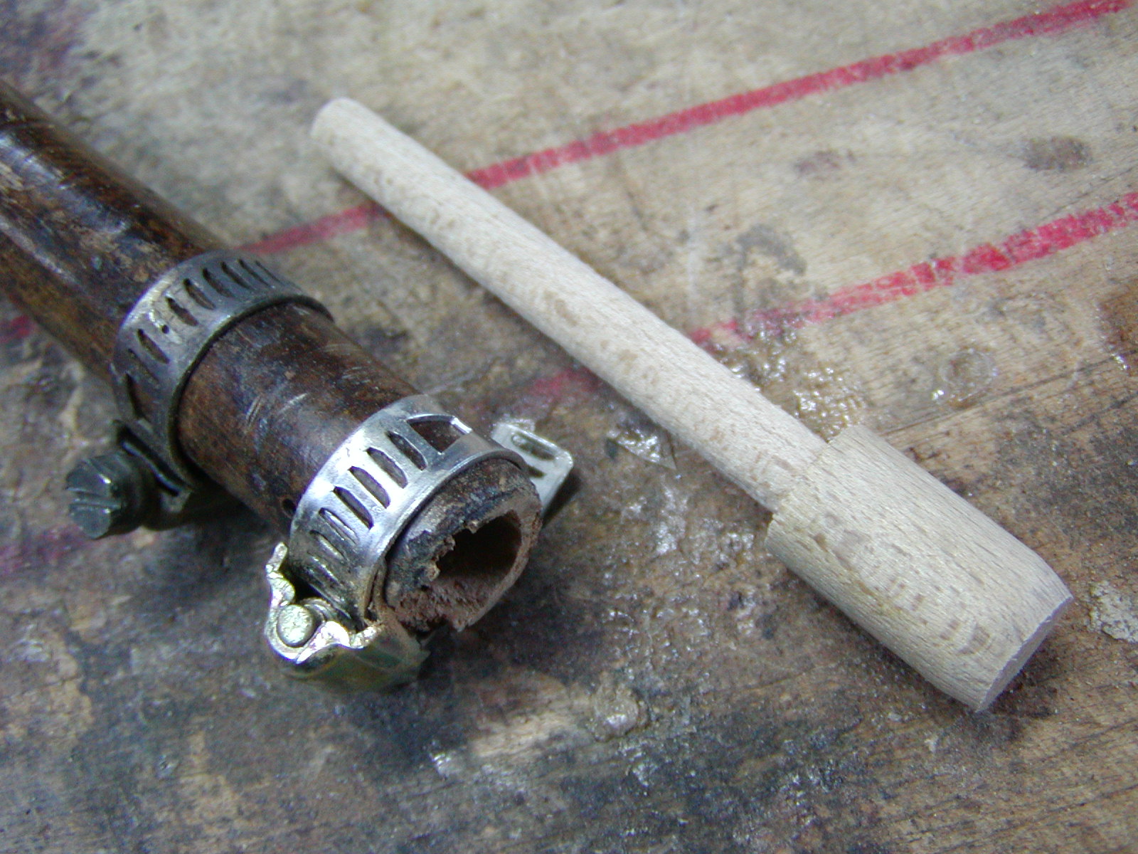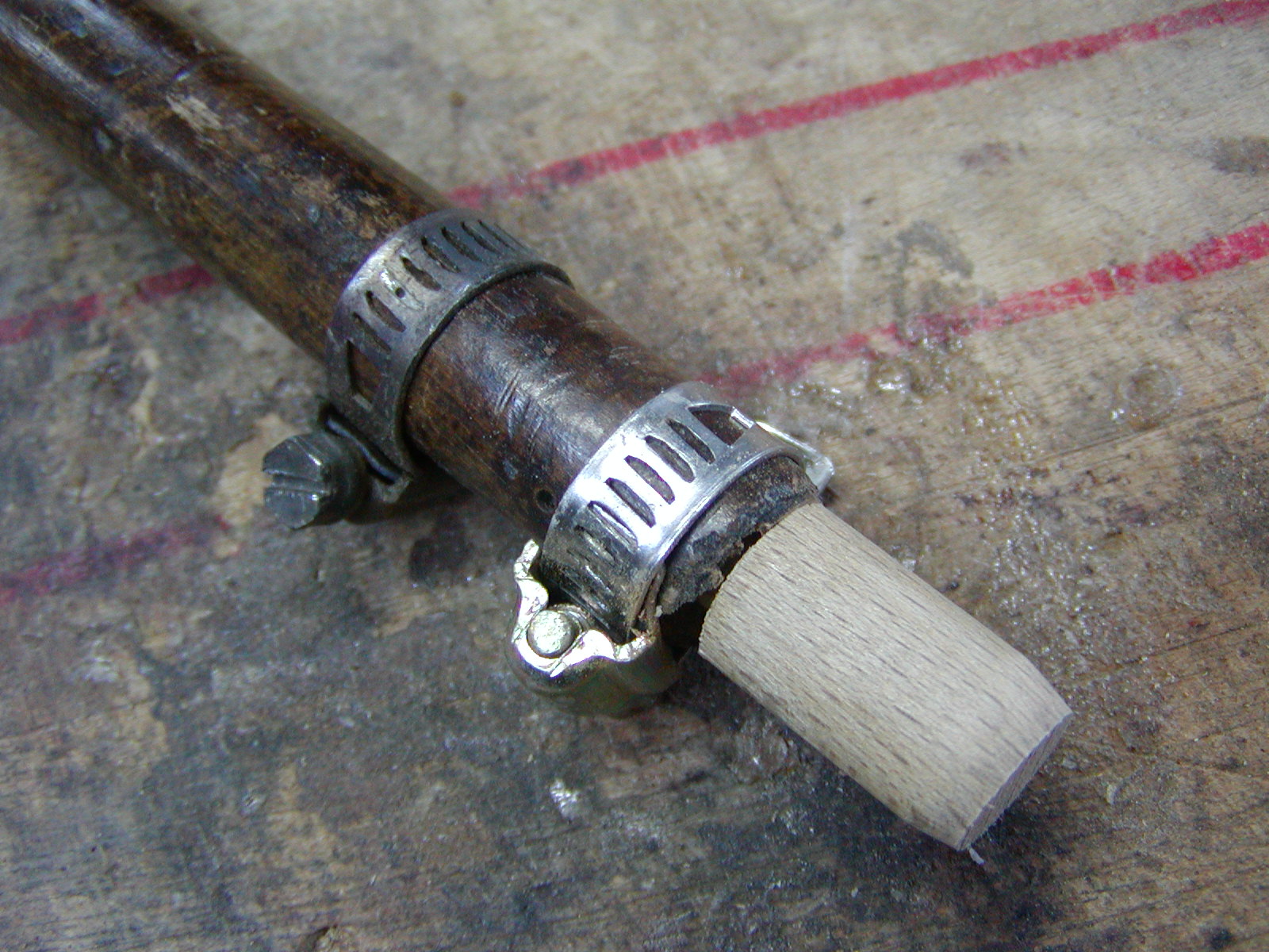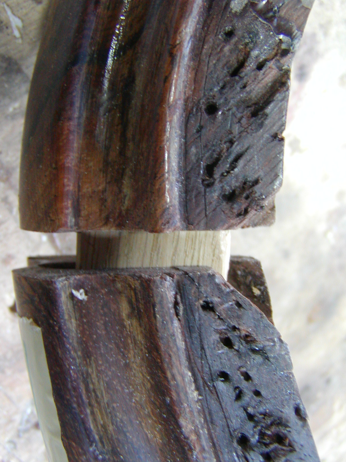 Lorsque la cheville ne tient plus car le tenon a lâché, la seule et unique solution est de reconstituer le tenon par une pièce en queue d’aronde.