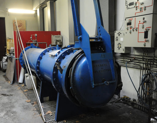 Lorsque l’imprégnation est terminée, la cuve est vidée de la résine inutilisée qui sera filtrée pour une utilisation ultérieure. Un premier essuyage est alors effectué, et l’objet emballé dans du tissu est placé dans une casemate d’irradiation, étanche en béton, qui surplombe une » piscine » où sont stockées des barres de cobalt 60, émetteur des rayons Gamma. Une ouverture est pratiquée dans la partie inférieure de la casemate afin de permettre la circulation des barres de cobalt. L’eau et le béton ont un rôle de protection biologique du personnel