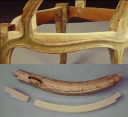 La restauration des sièges ne diffère guère de celle des panneaux. Une traverse piquée au point de ne pouvoir être sauvegardée par les moyens traditionnels, va trouver sa solution logique au C.N.E.G. Mais après le traitement le tapissier aura du mal à clouer ses semences dans le bois consolidé.