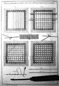 La garniture un brin dans une diagonale, un brin dans l’autre diagonale. Les brins en diagonale doivent avoir une largeur supérieure d’un tiers.Le dernier brin devrait, pour les ouvrages de qualité avoir des chevilles collées