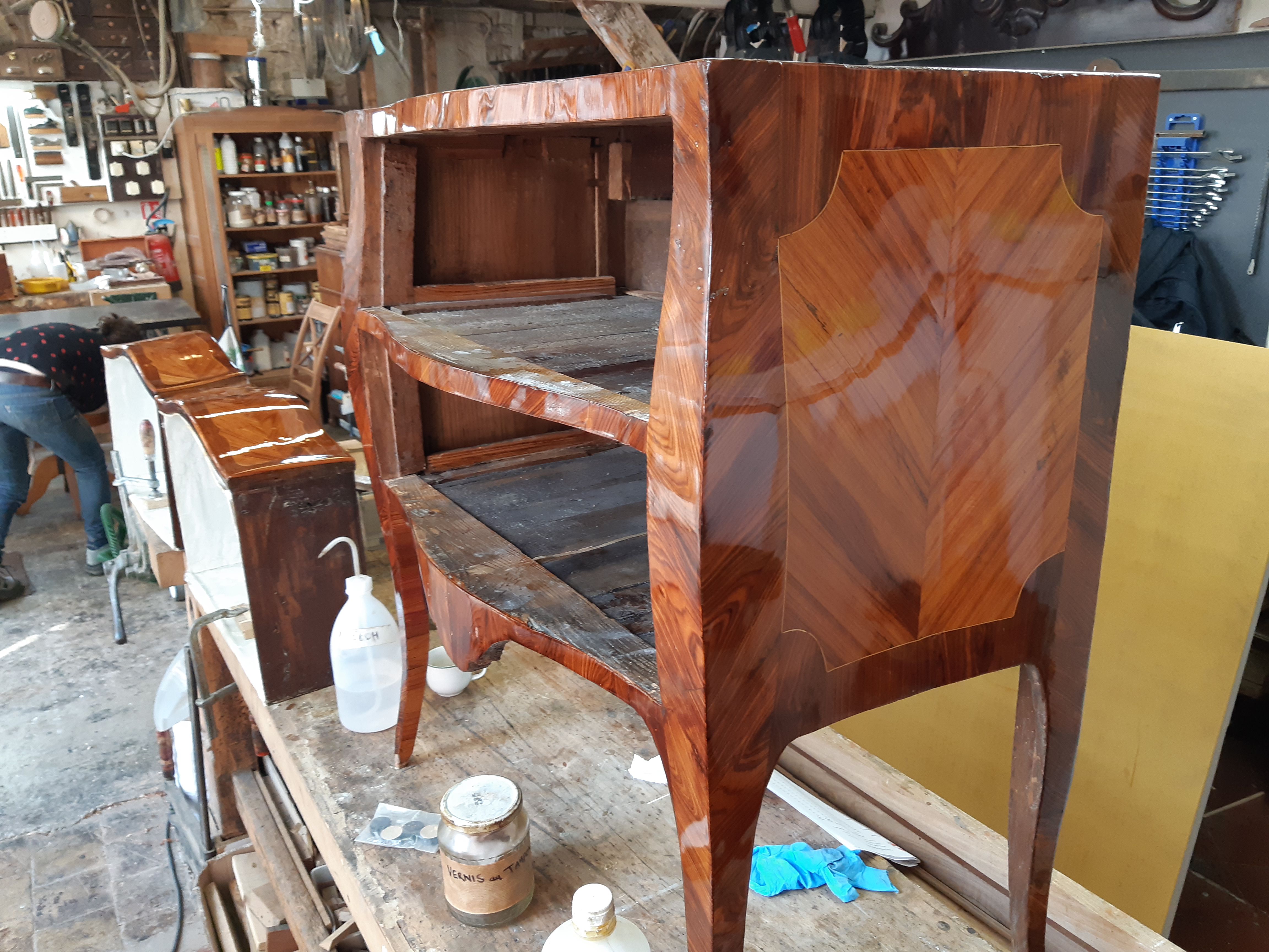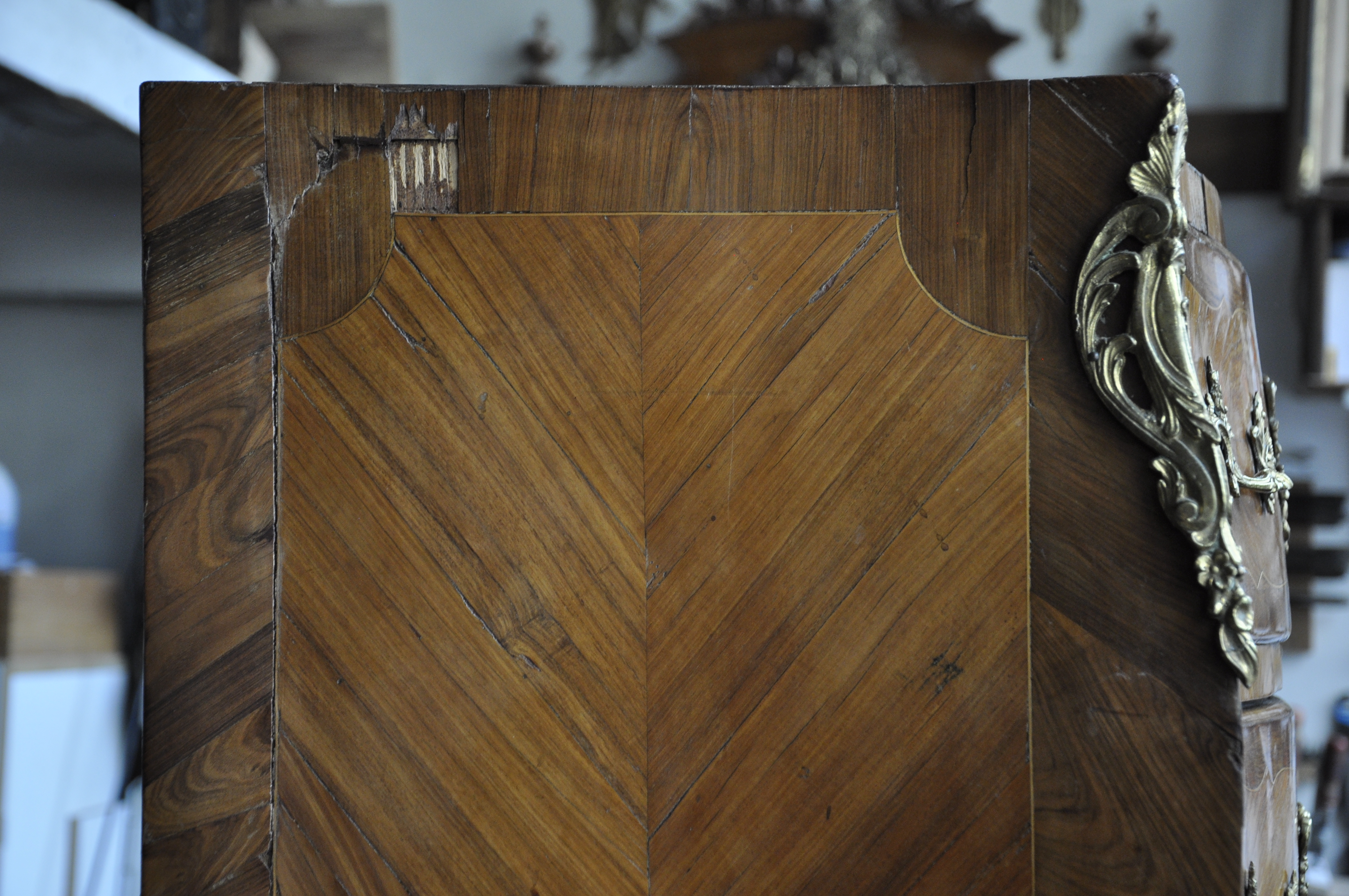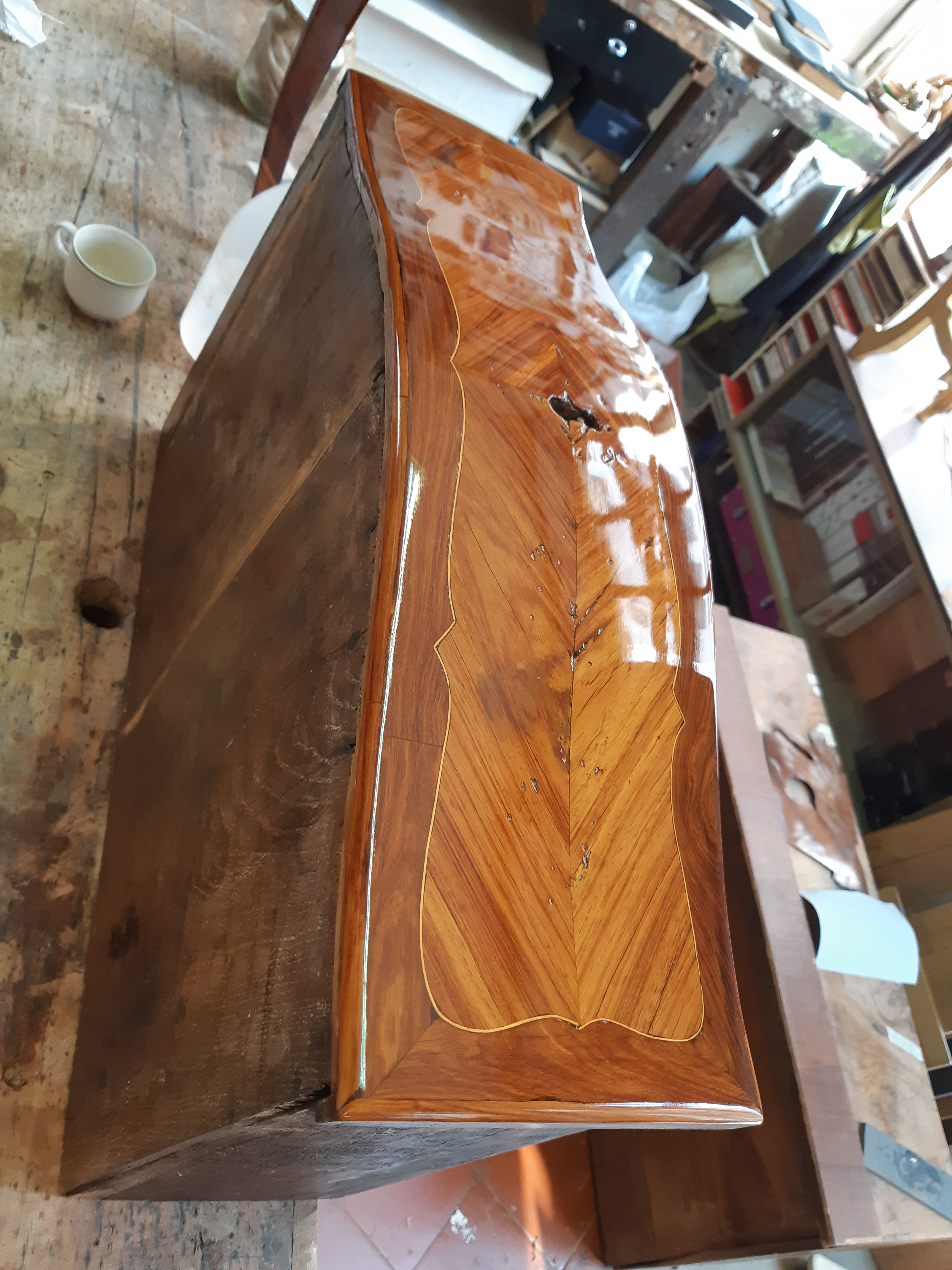 Bien fatiguée, nous avons du déplaquer le coté gauche pour recoller le bâti qui s’était rétracté. Une fois les lacunes comblées, le placage reposé, les bronzes nettoyés, un vernis au tampon est venu mettre le tout en valeur : à vous de juger !