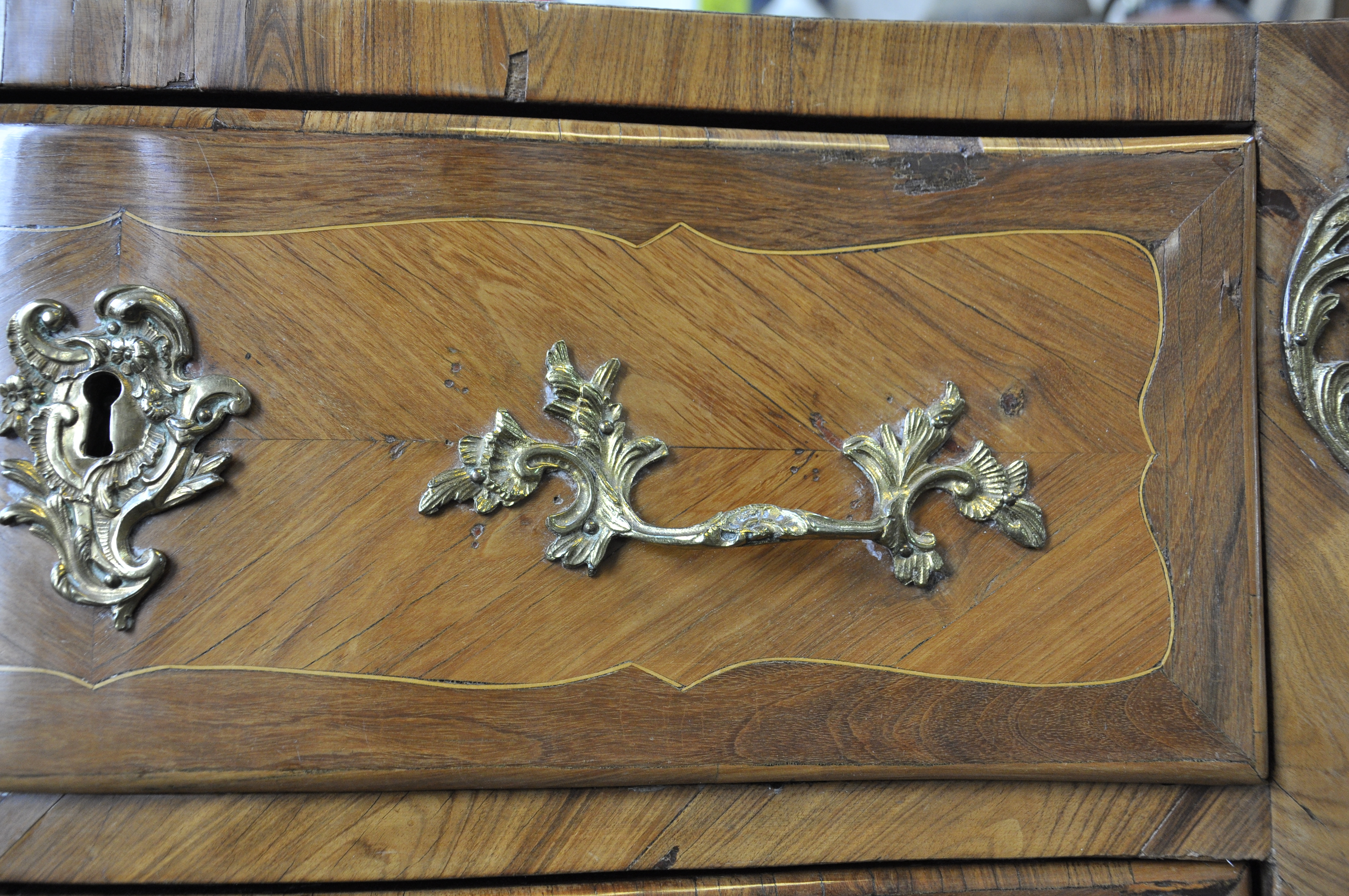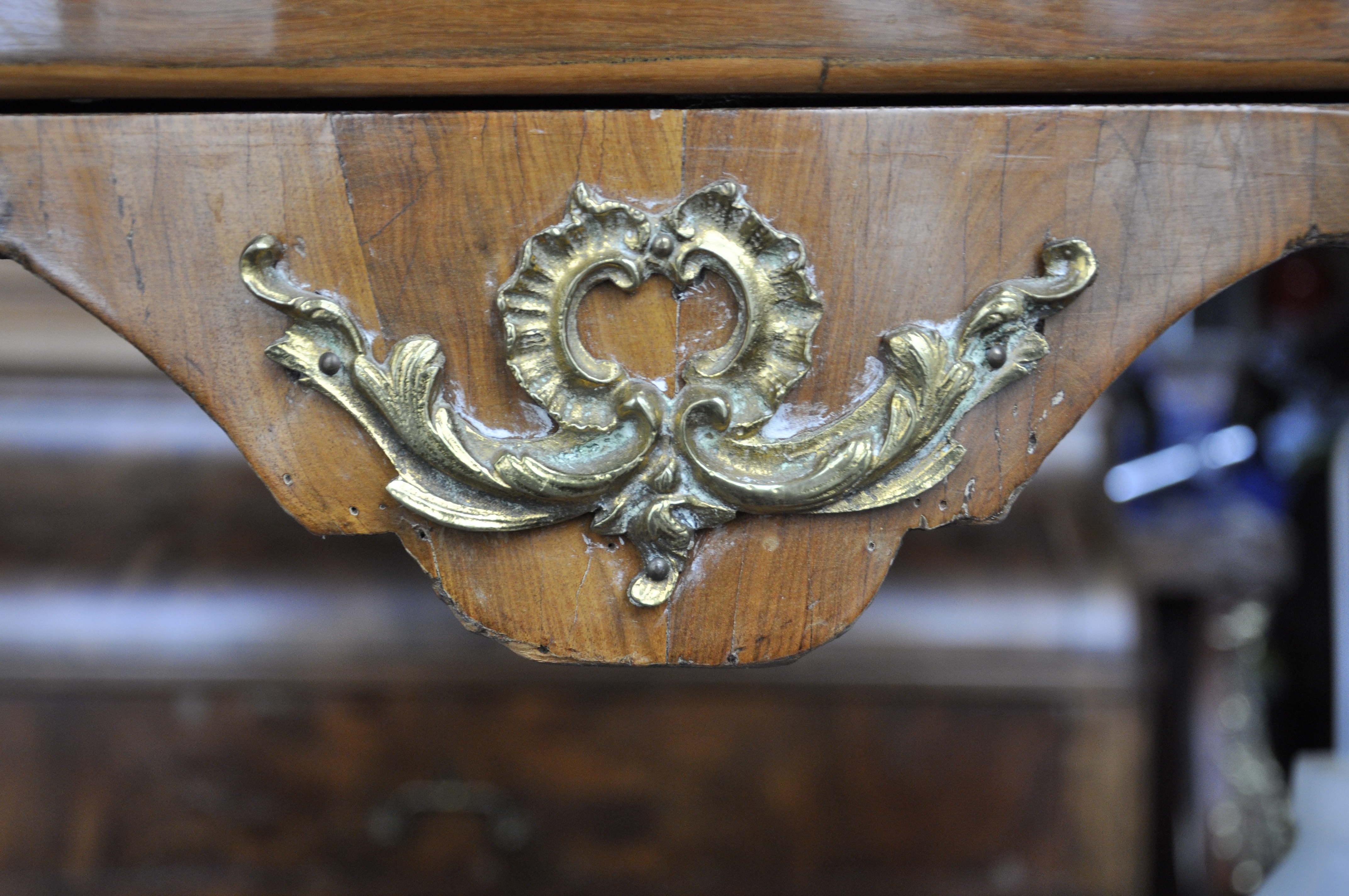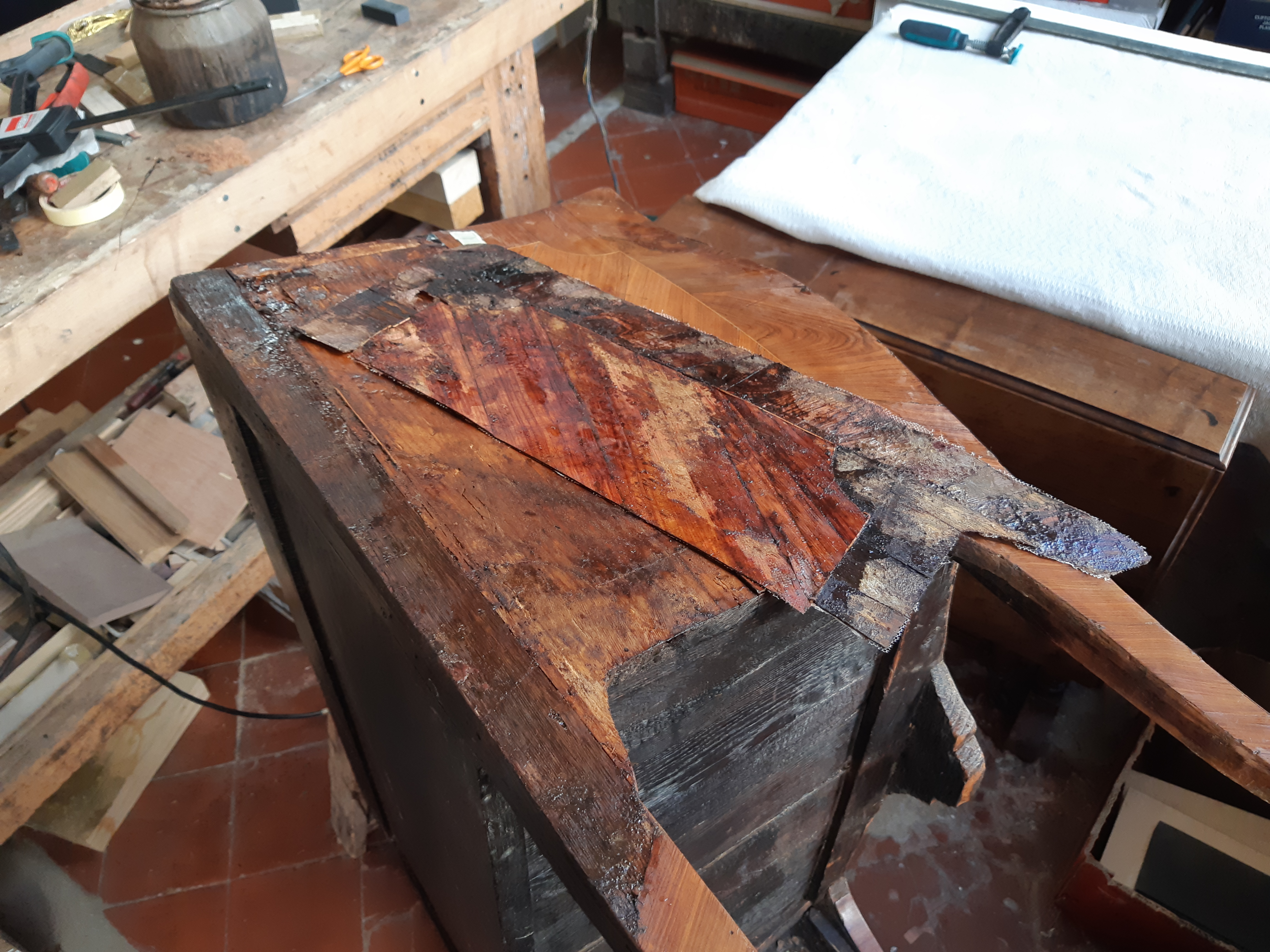 Bien fatiguée, nous avons du déplaquer le coté gauche pour recoller le bâti qui s’était rétracté. Une fois les lacunes comblées, le placage reposé, les bronzes nettoyés, un vernis au tampon est venu mettre le tout en valeur : à vous de juger !