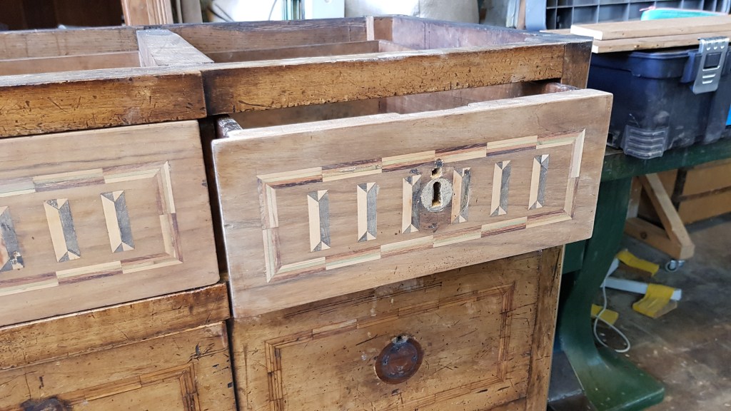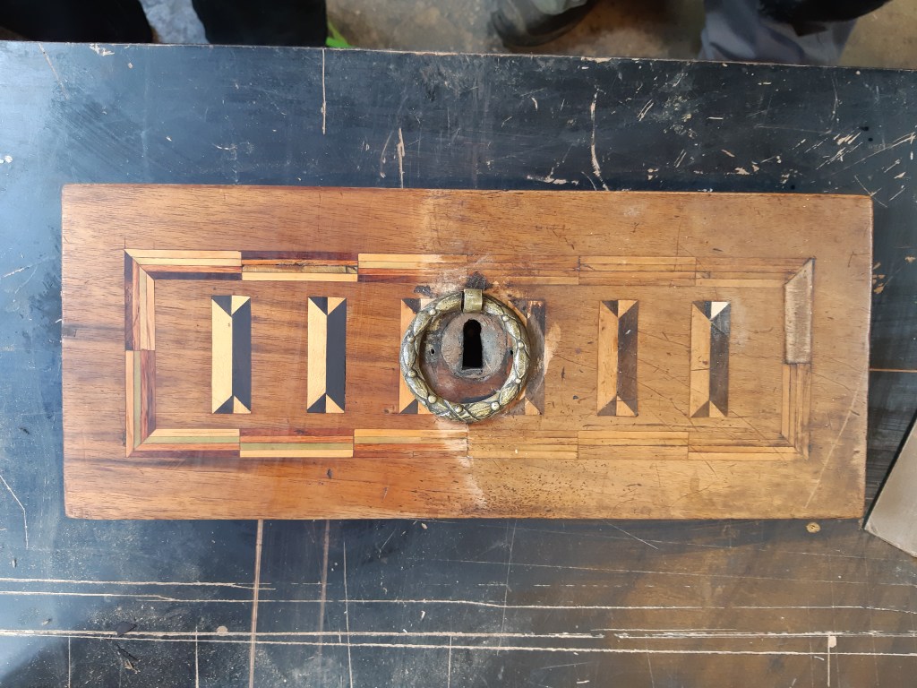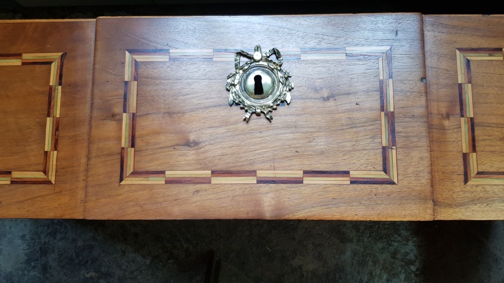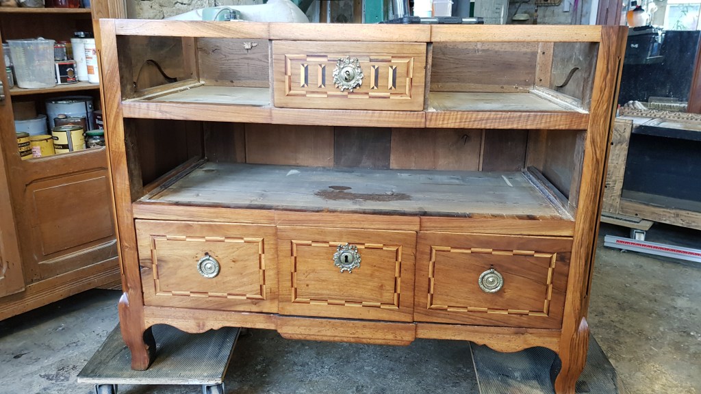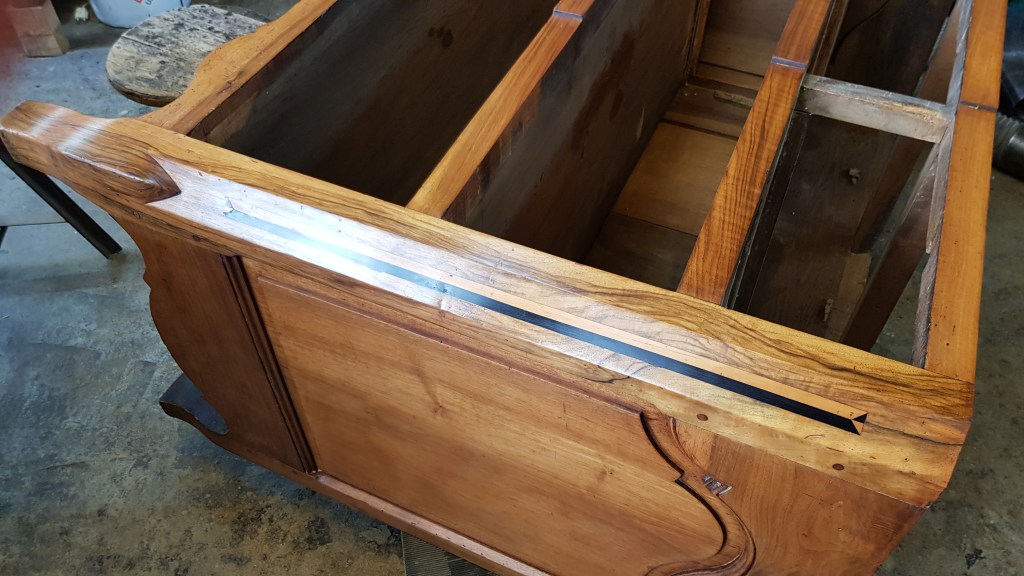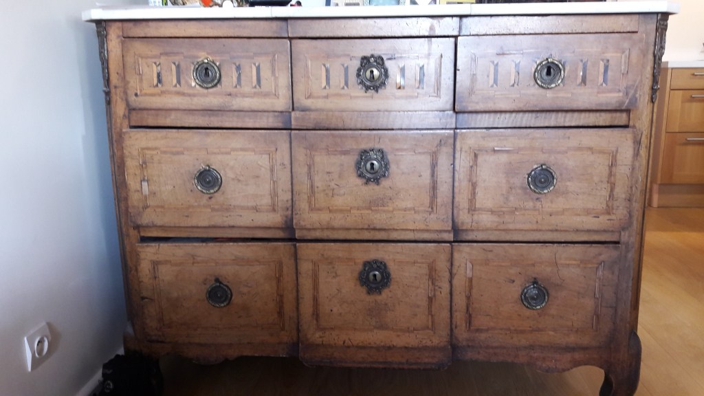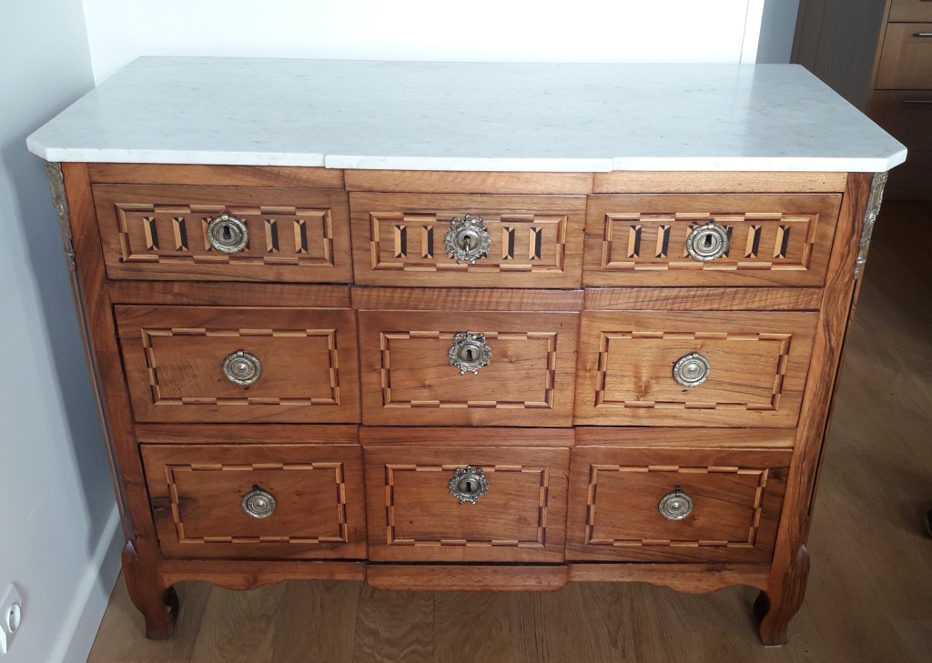 Une jolie commode transition en noyer massif avec incrustation de filets et marqueterie nous a été confié. Le soleil avait fait son œuvre : il ne restait pas grand chose de lisible sur cette vielle dame dont les morceaux tombaient tant la colle avait cristallisée et les tiroirs étaient si usés qu’ils ne s’ouvraient plus que difficilement. Il était temps d’agir ! Après un démontage complet et un rechargement des tiroirs et coulisseaux, nous avons recollé et complété la marqueterie de façade. Un décapage a permis d’en retrouver les contrastes et la jolie couleur du noyer. Un peu de « patte-mouille » pour atténuer les rayures et enfoncements, un bon nettoyage des bronzes, et enfin, pour finir : une bonne couche de cire blonde !
