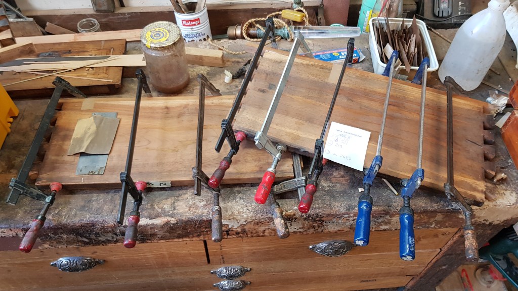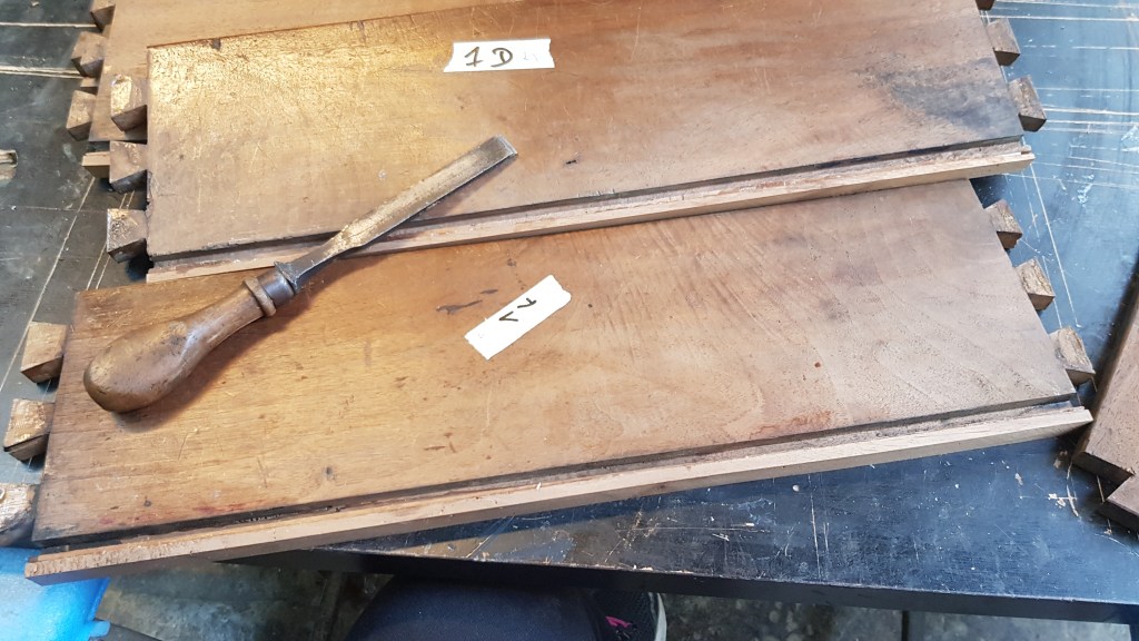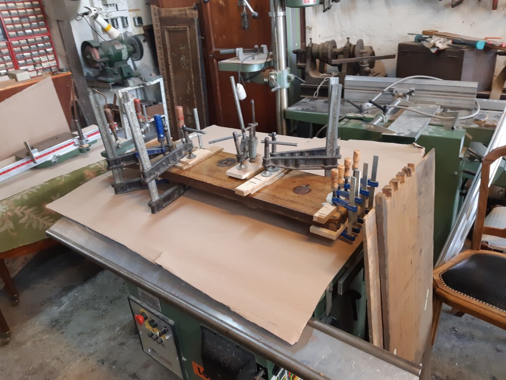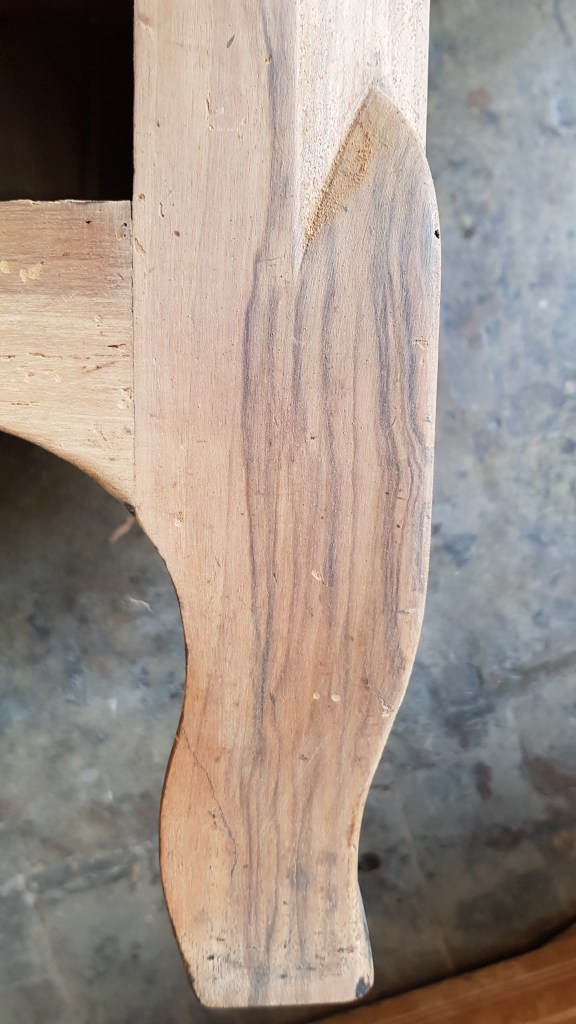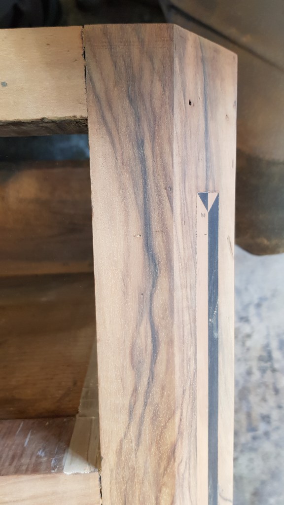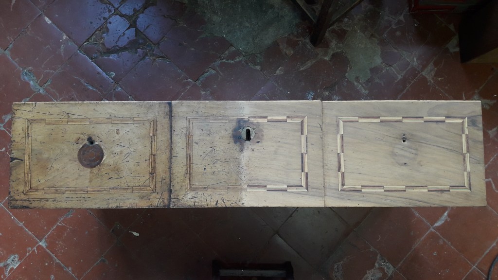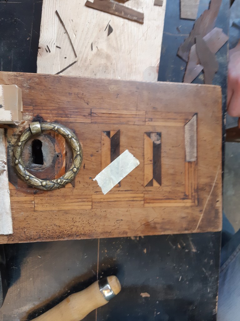 Une jolie commode transition en noyer massif avec incrustation de filets et marqueterie nous a été confié. Le soleil avait fait son œuvre : il ne restait pas grand chose de lisible sur cette vielle dame dont les morceaux tombaient tant la colle avait cristallisée et les tiroirs étaient si usés qu’ils ne s’ouvraient plus que difficilement. Il était temps d’agir ! Après un démontage complet et un rechargement des tiroirs et coulisseaux, nous avons recollé et complété la marqueterie de façade. Un décapage a permis d’en retrouver les contrastes et la jolie couleur du noyer. Un peu de « patte-mouille » pour atténuer les rayures et enfoncements, un bon nettoyage des bronzes, et enfin, pour finir : une bonne couche de cire blonde !