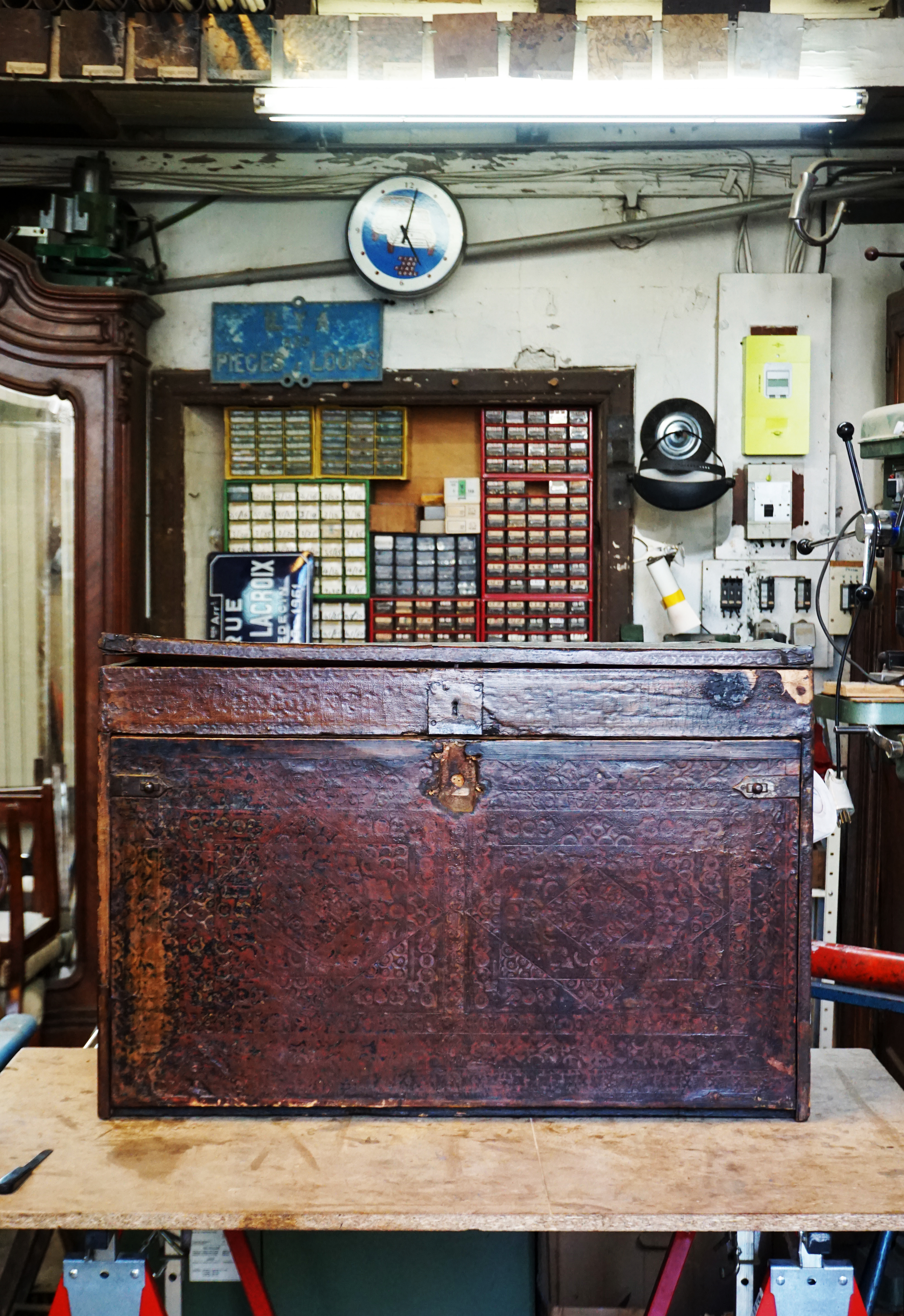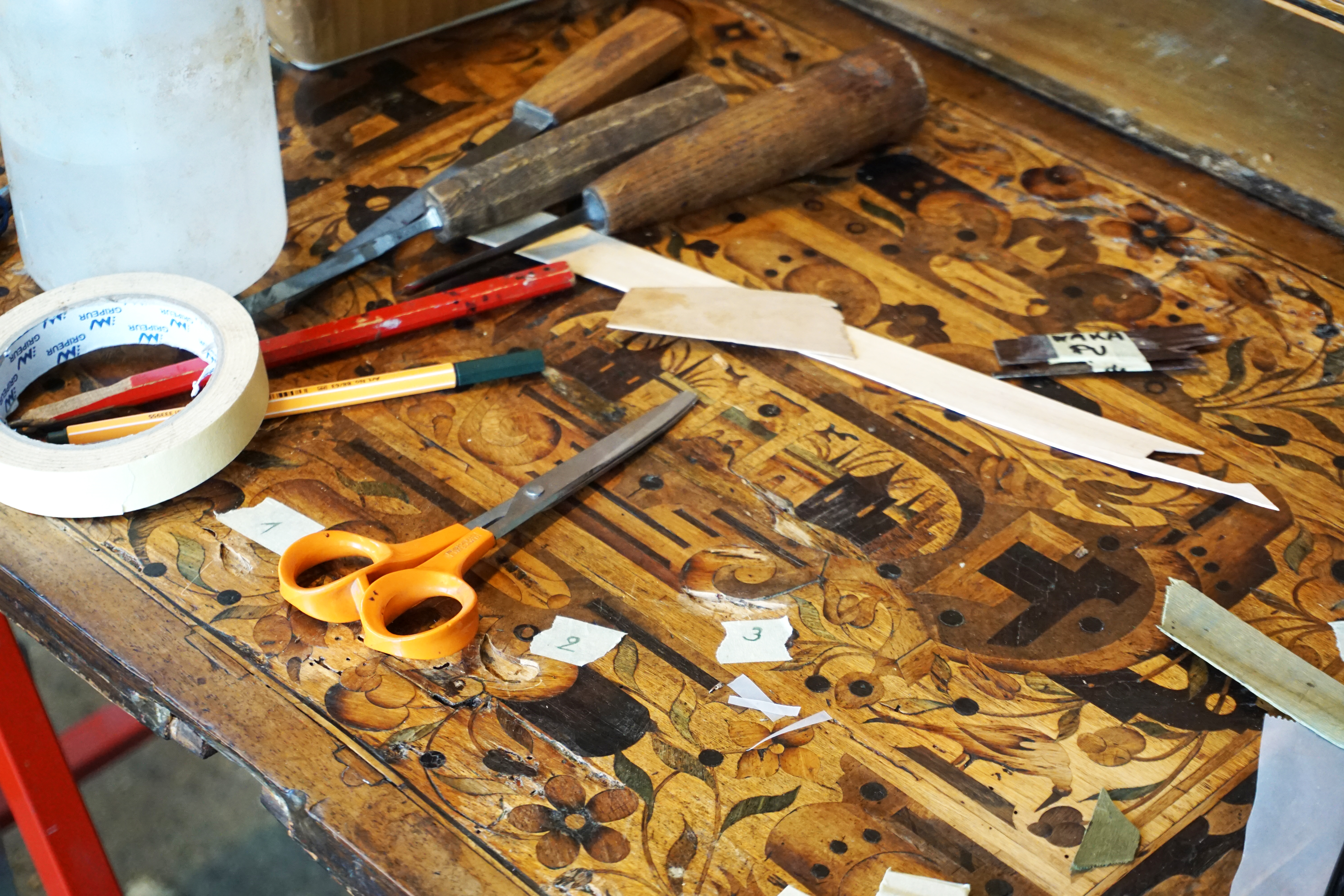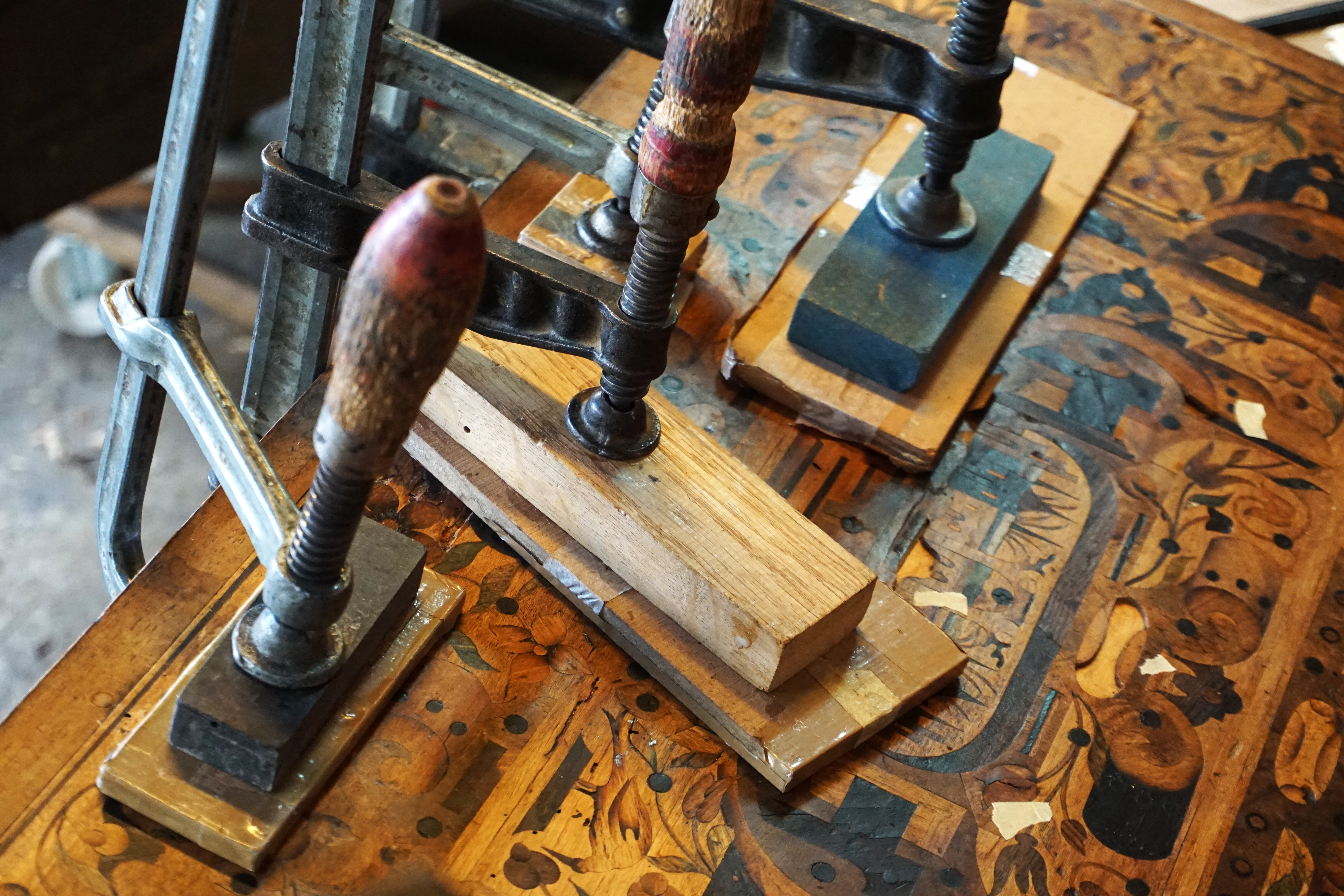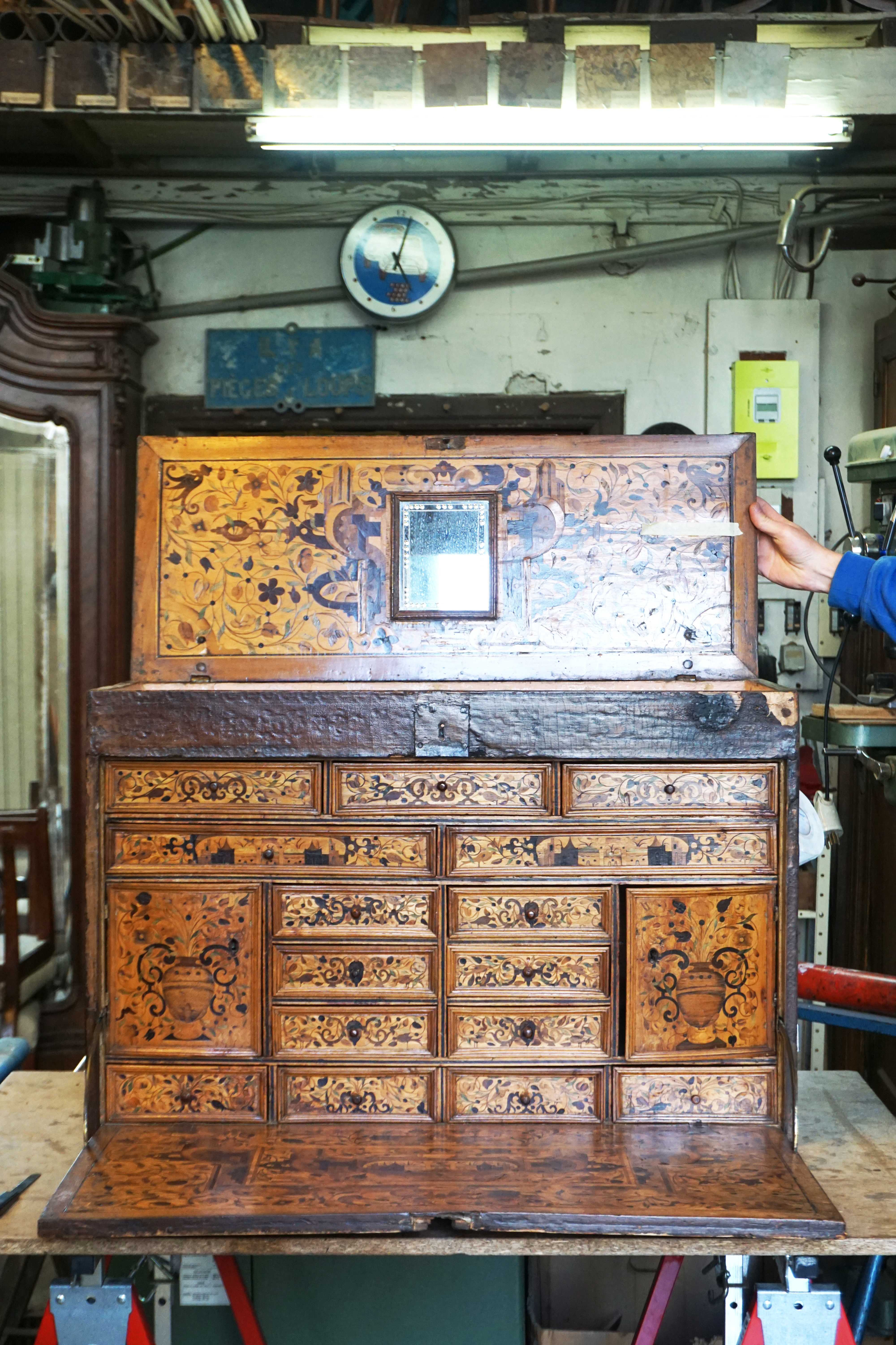 Recollage complet de la marqueterie. Consolidation du bois avec résines paraloïdes réversibles. Dépose des anciens rebouchages de cire, puis suivant la taille du manque : comblement à la résine ou remplacement par une pièce en bois de même essence. Décapage complet, notamment du coté gauche du meuble dont le gaufrage avait disparu sous l’épaisse couche de peinture. Réancrage de la charnière, changement des vis de la serrure, remontage, mise en teinte.