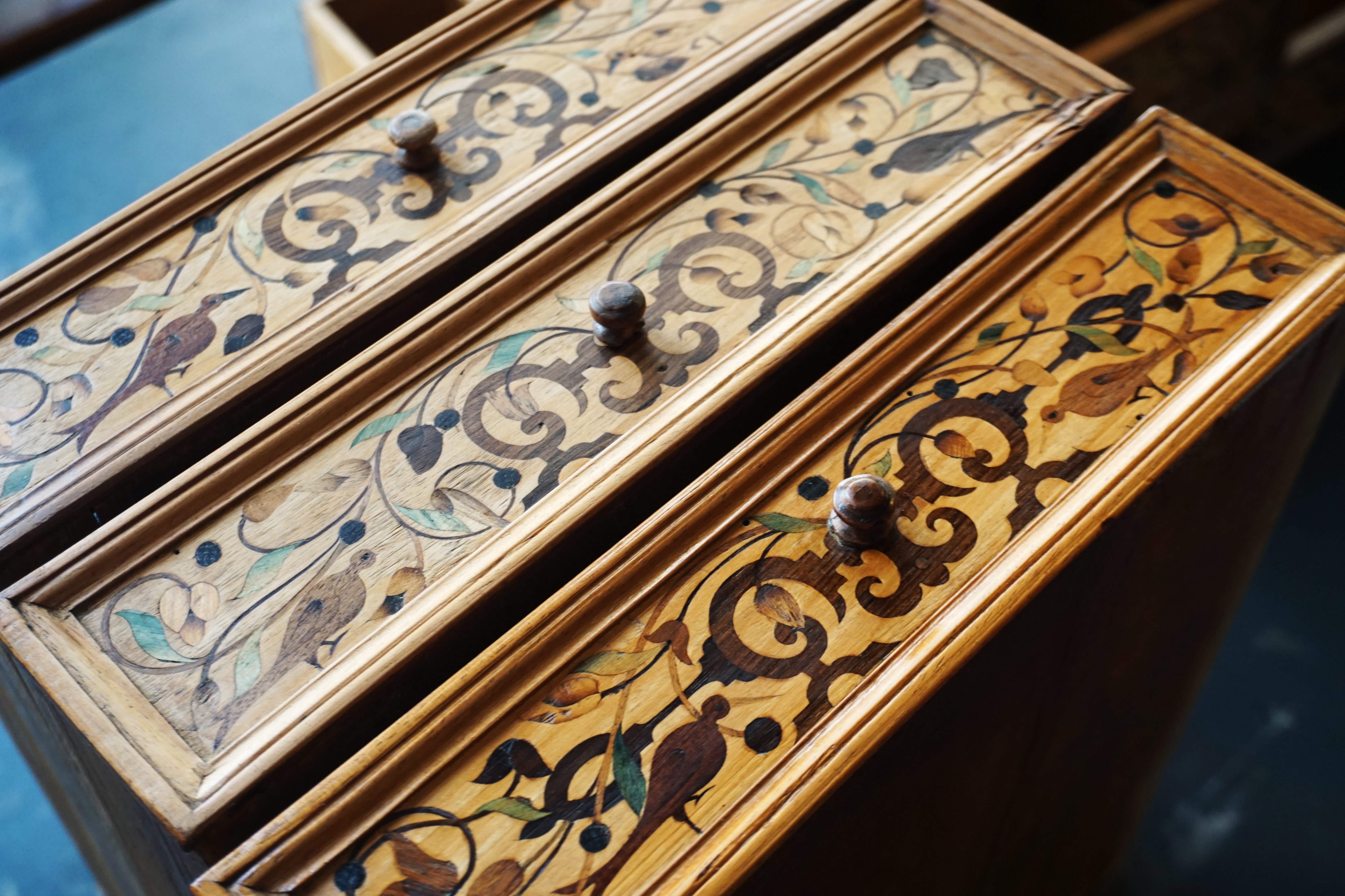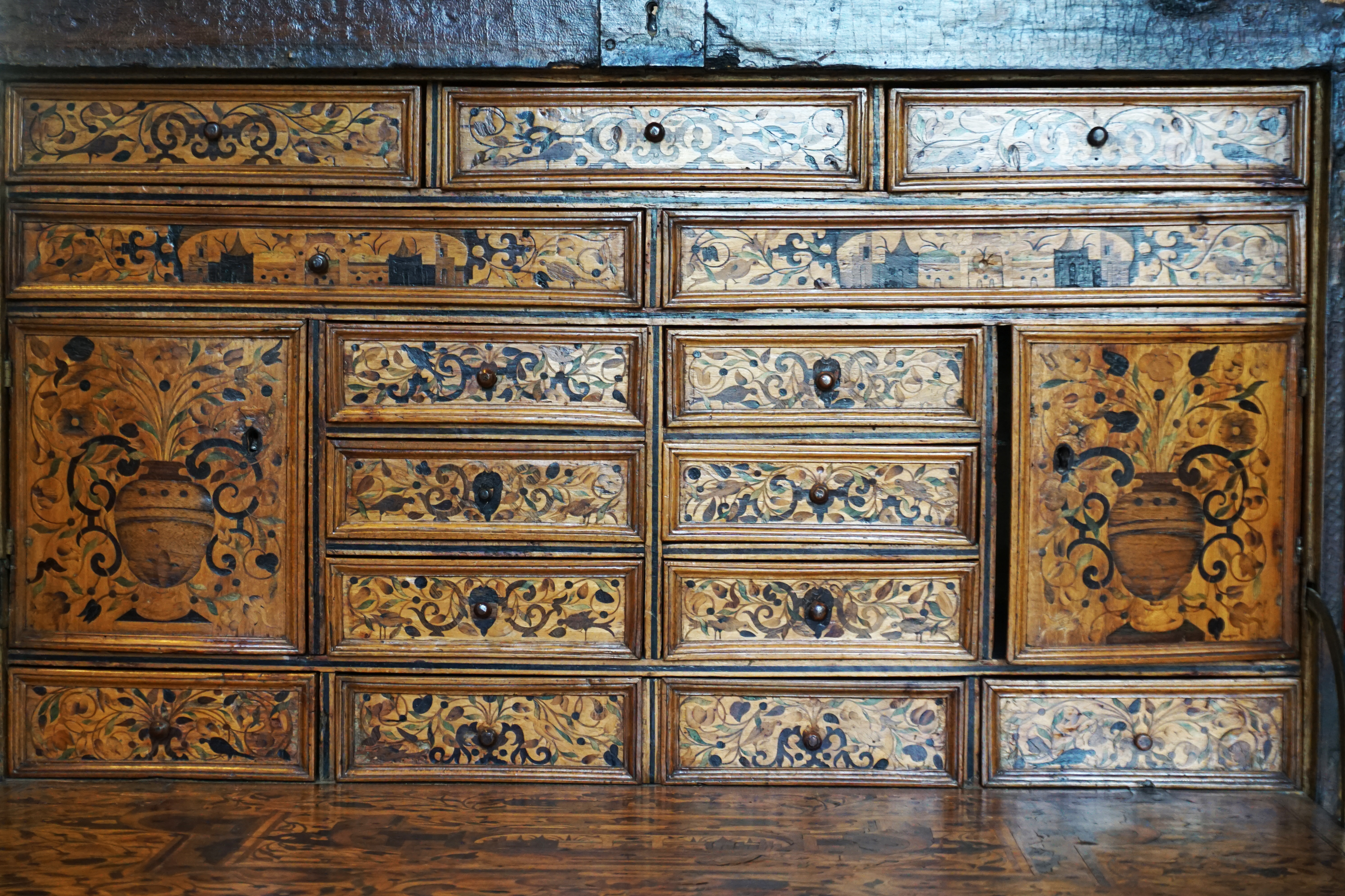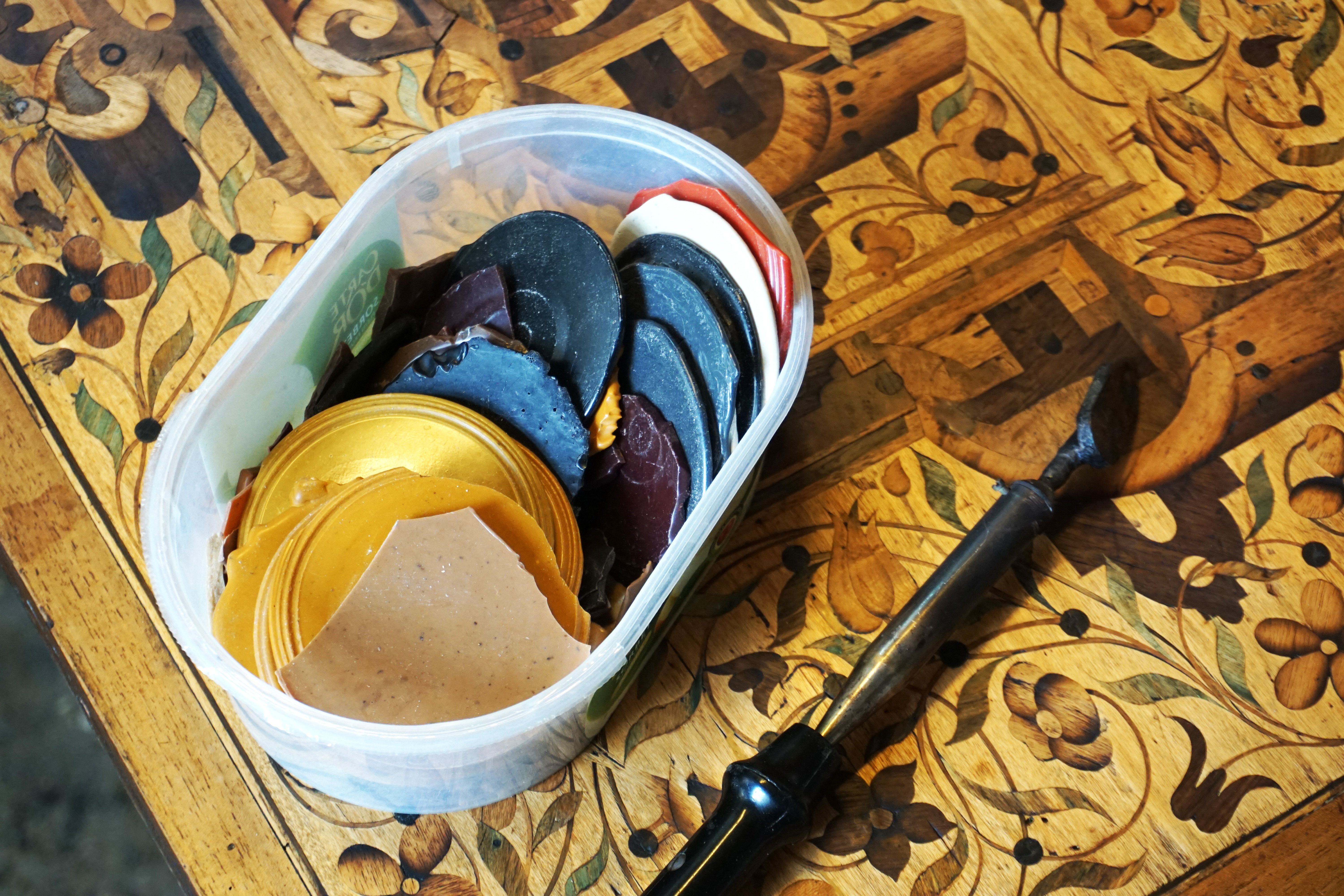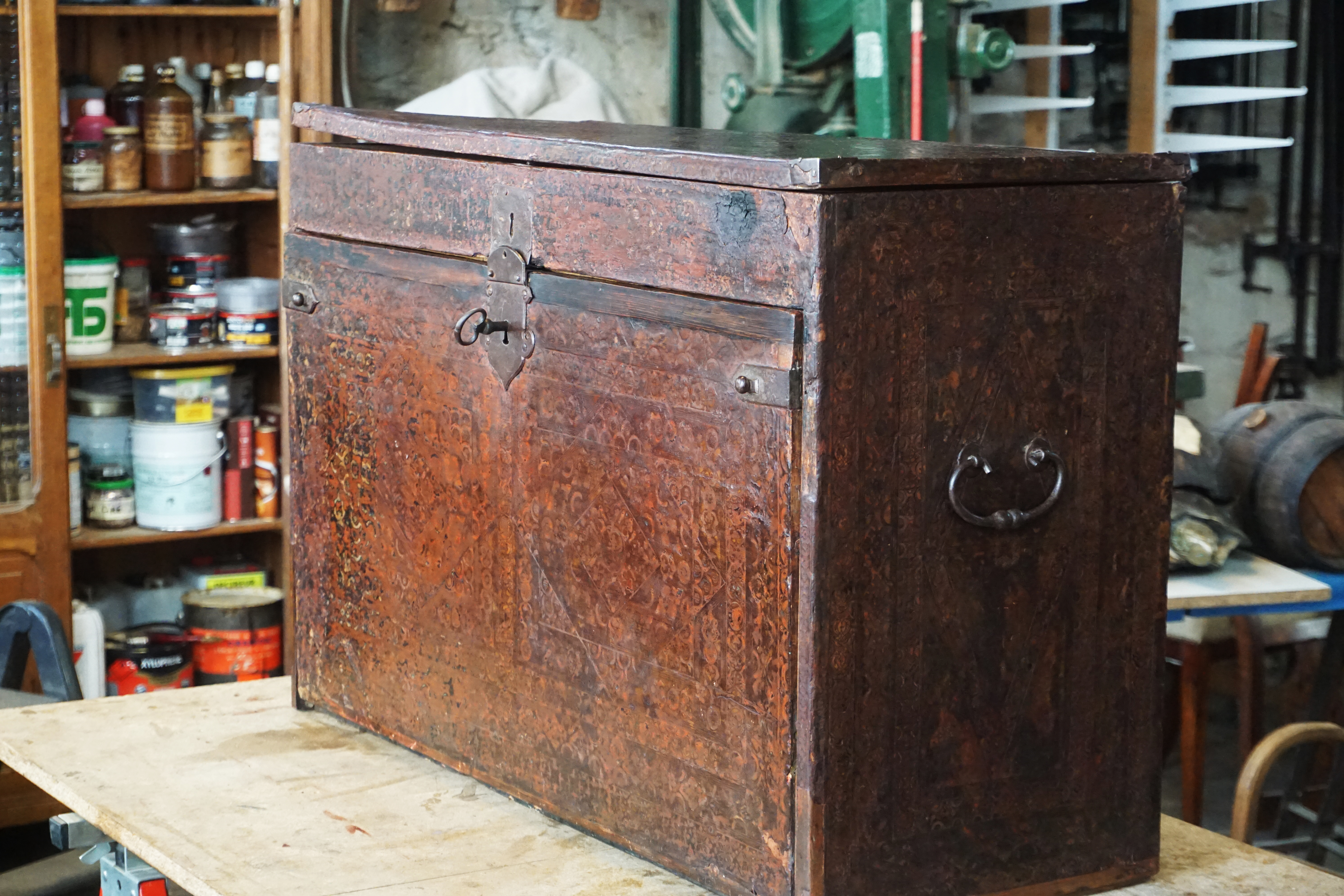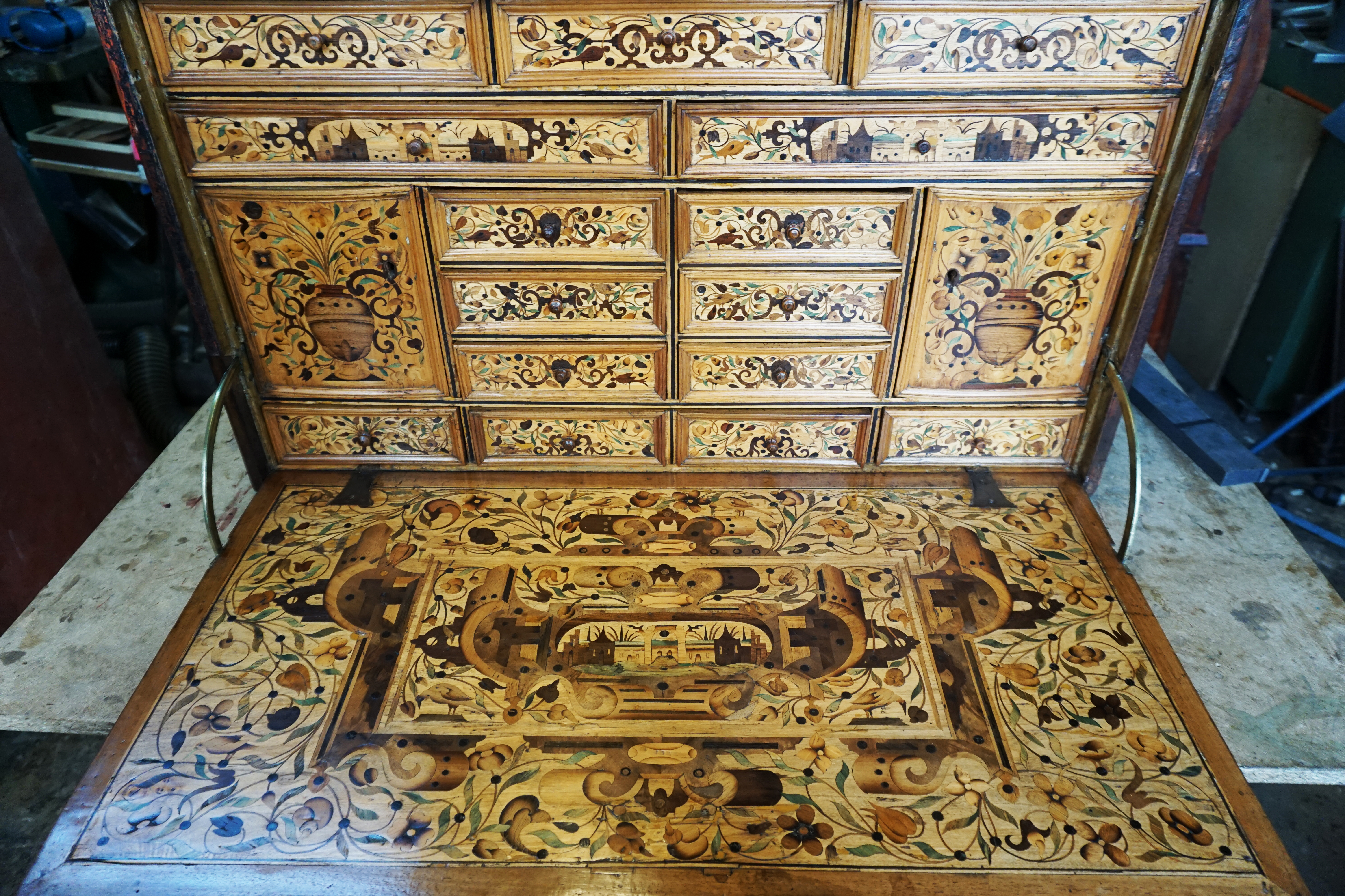 Recollage complet de la marqueterie. Consolidation du bois avec résines paraloïdes réversibles. Dépose des anciens rebouchages de cire, puis suivant la taille du manque : comblement à la résine ou remplacement par une pièce en bois de même essence. Décapage complet, notamment du coté gauche du meuble dont le gaufrage avait disparu sous l’épaisse couche de peinture. Réancrage de la charnière, changement des vis de la serrure, remontage, mise en teinte.
