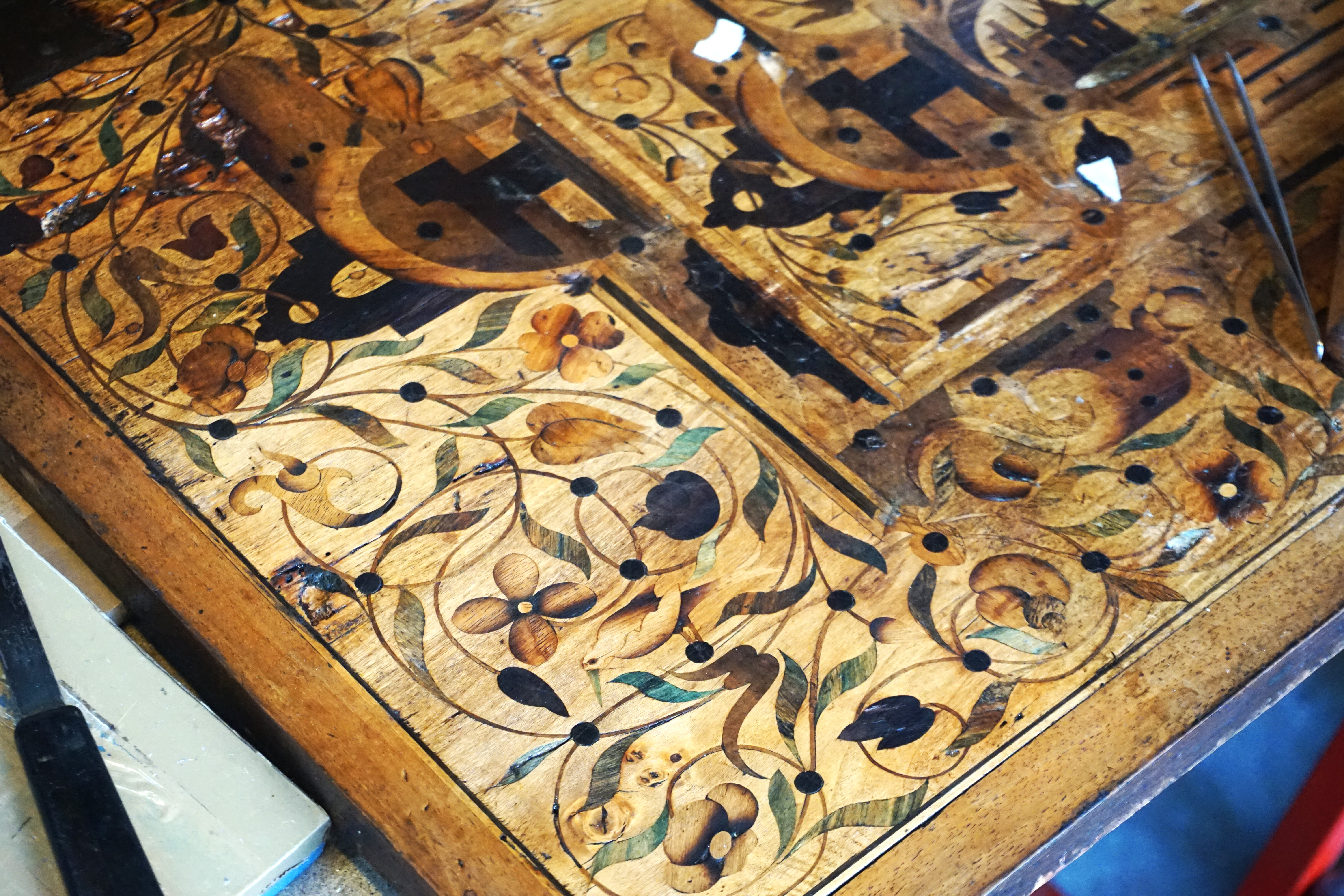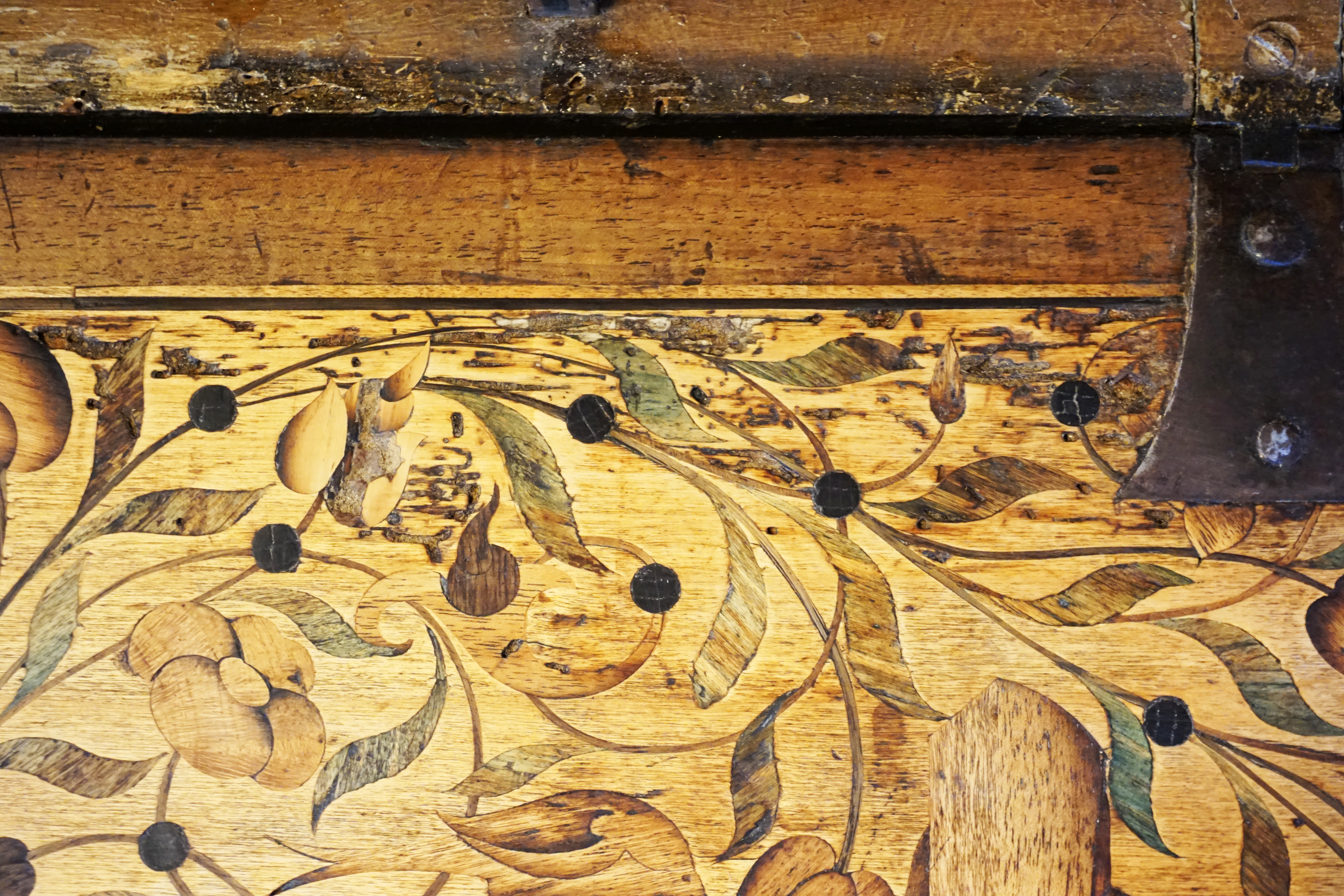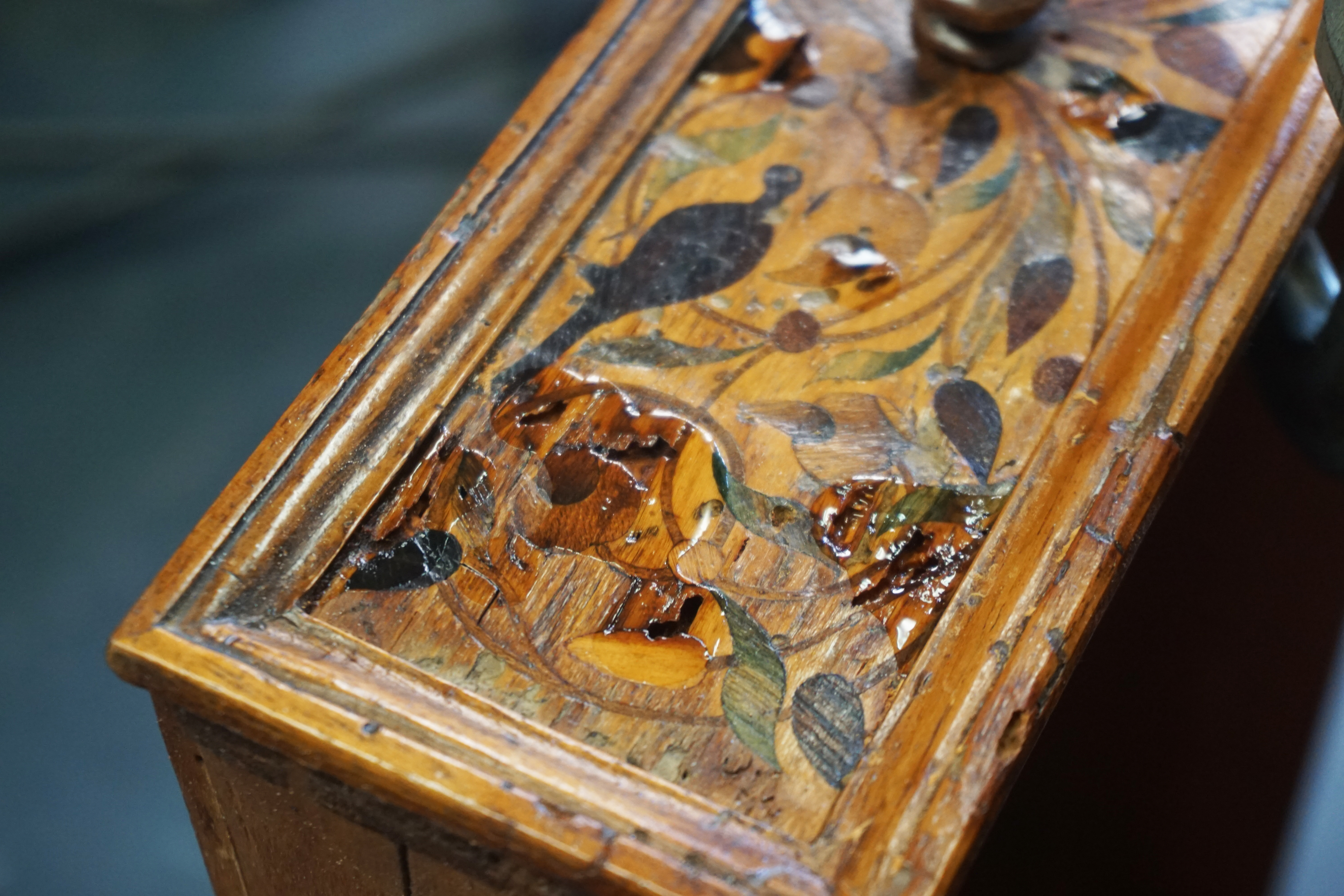 Fortement attaqué par des insectes ayant creusé des galeries sous la marqueterie, celle-ci se décolle par morceaux ainsi que les bouchages à la cire issus d’une précédente restauration. L’abattant est donc criblé de manques et la colle vieillissante risque d’aggraver la situation. On notera également un aplat de peinture recouvrant le cuir sur le coté gauche !