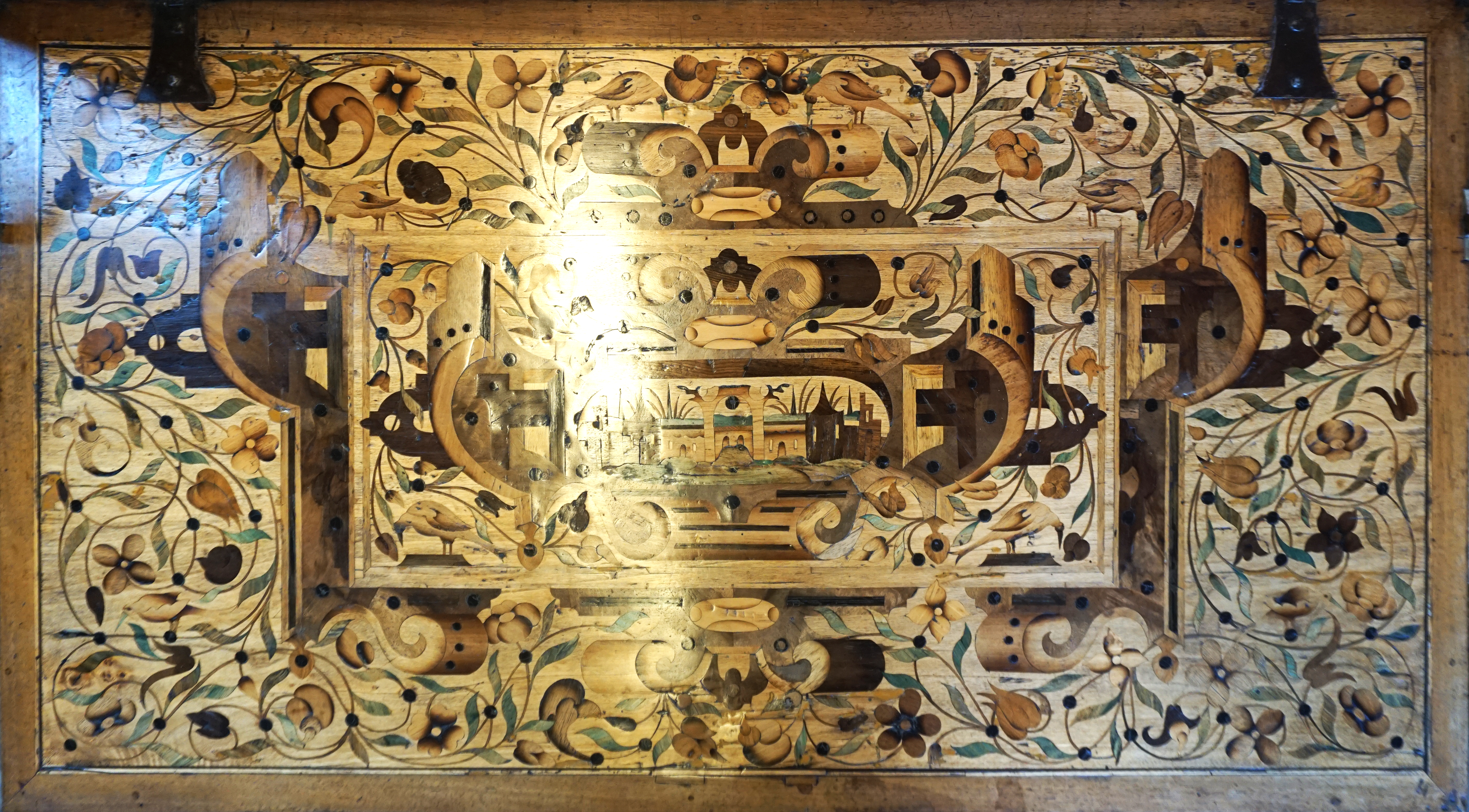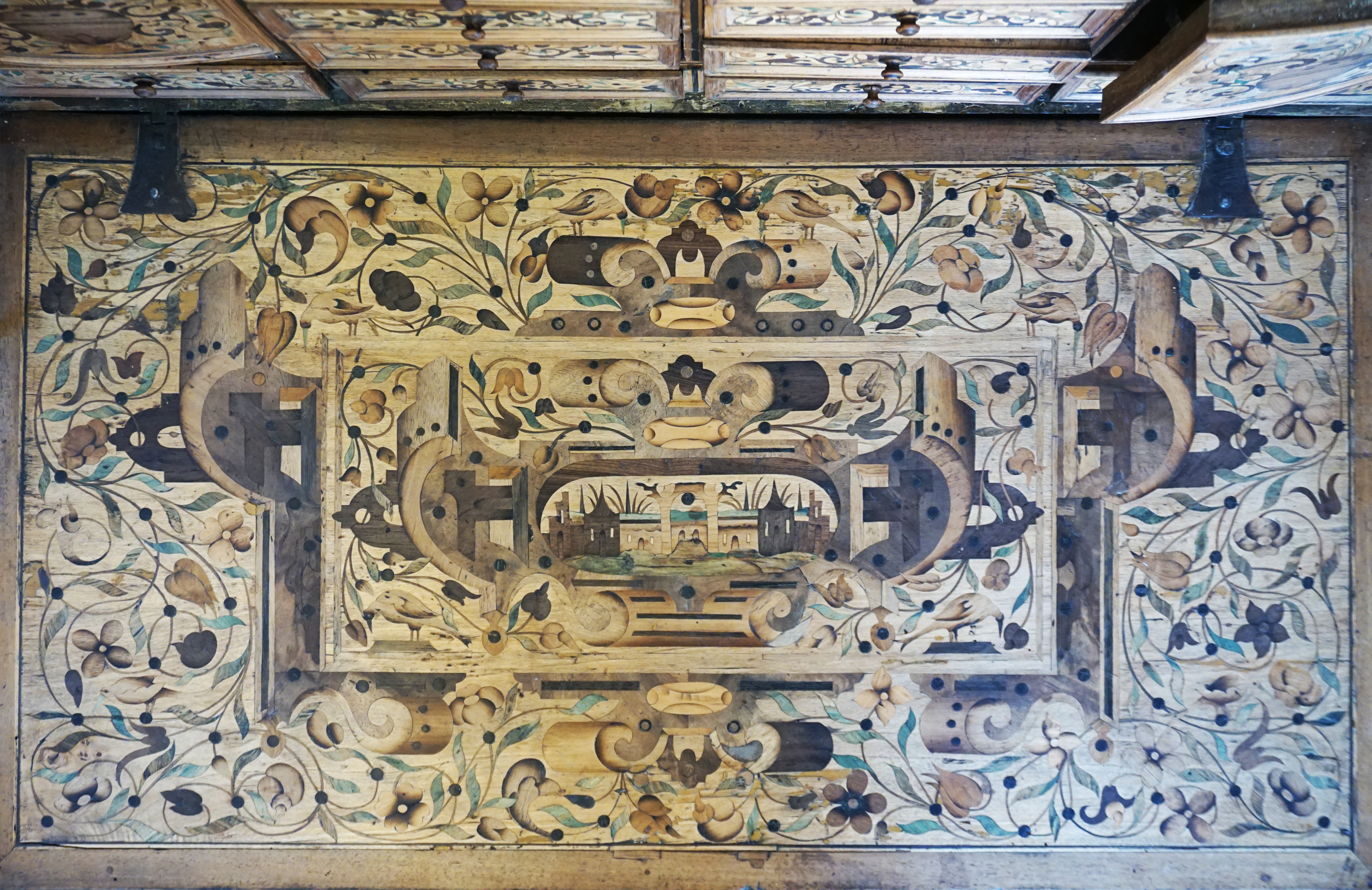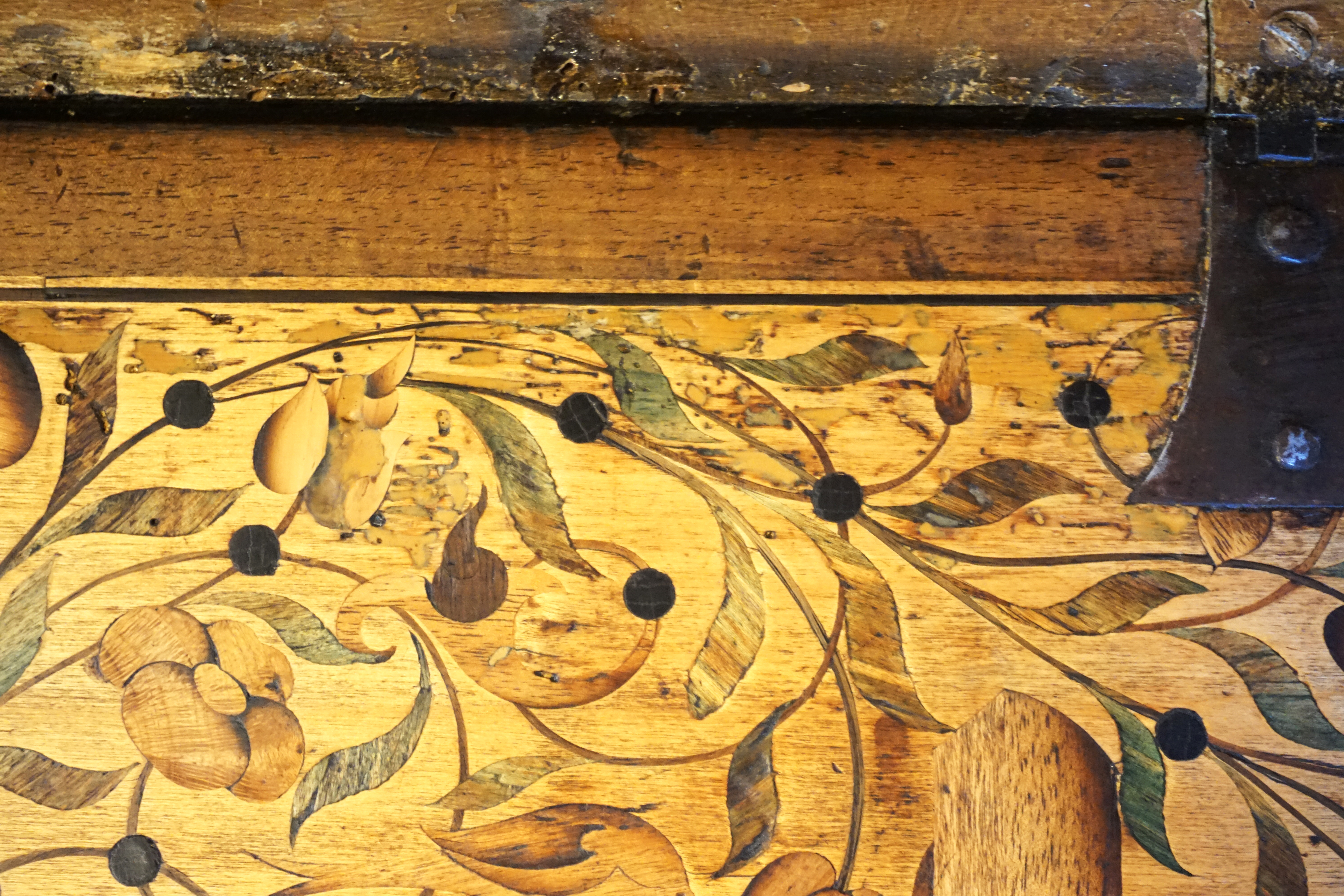 Fortement attaqué par des insectes ayant creusé des galeries sous la marqueterie, celle-ci se décolle par morceaux ainsi que les bouchages à la cire issus d’une précédente restauration. L’abattant est donc criblé de manques et la colle vieillissante risque d’aggraver la situation. On notera également un aplat de peinture recouvrant le cuir sur le coté gauche !
