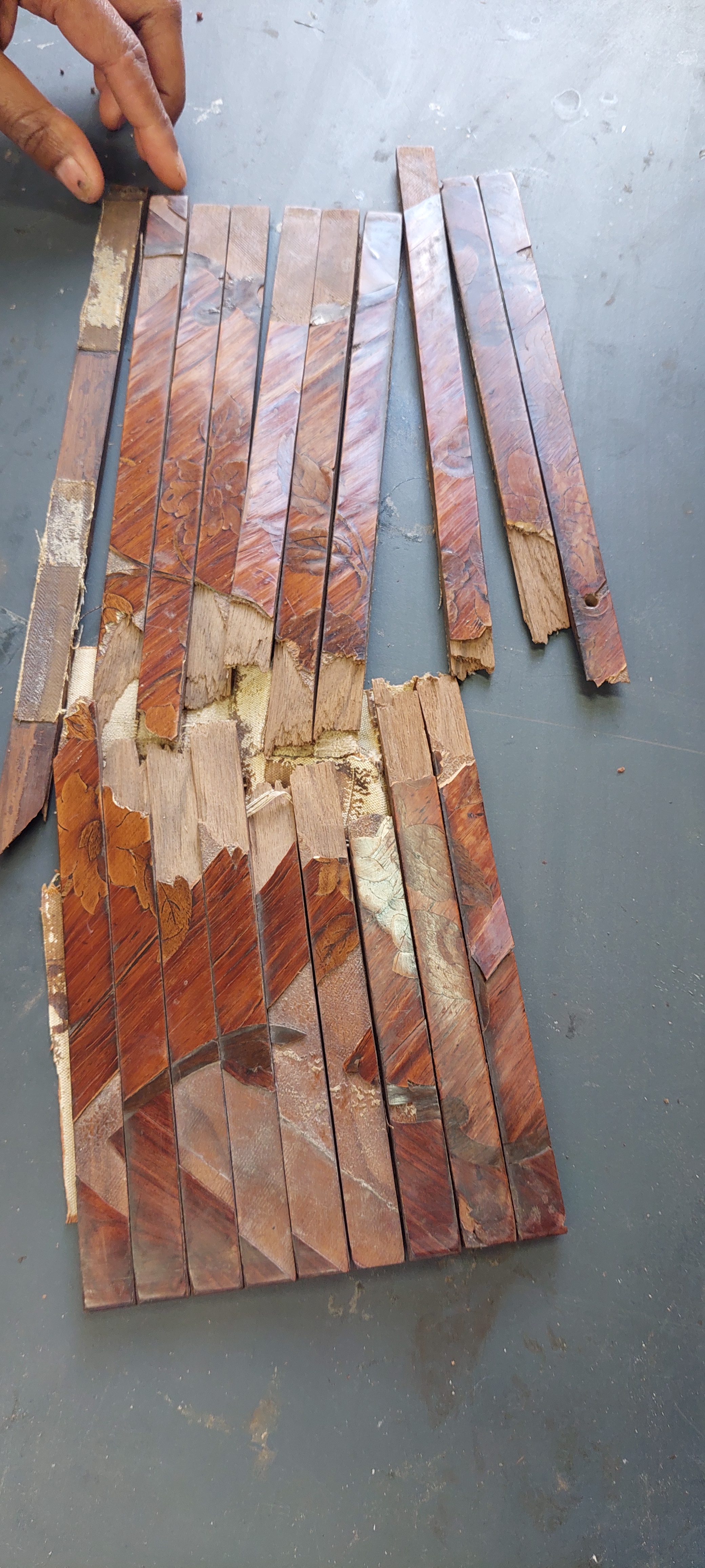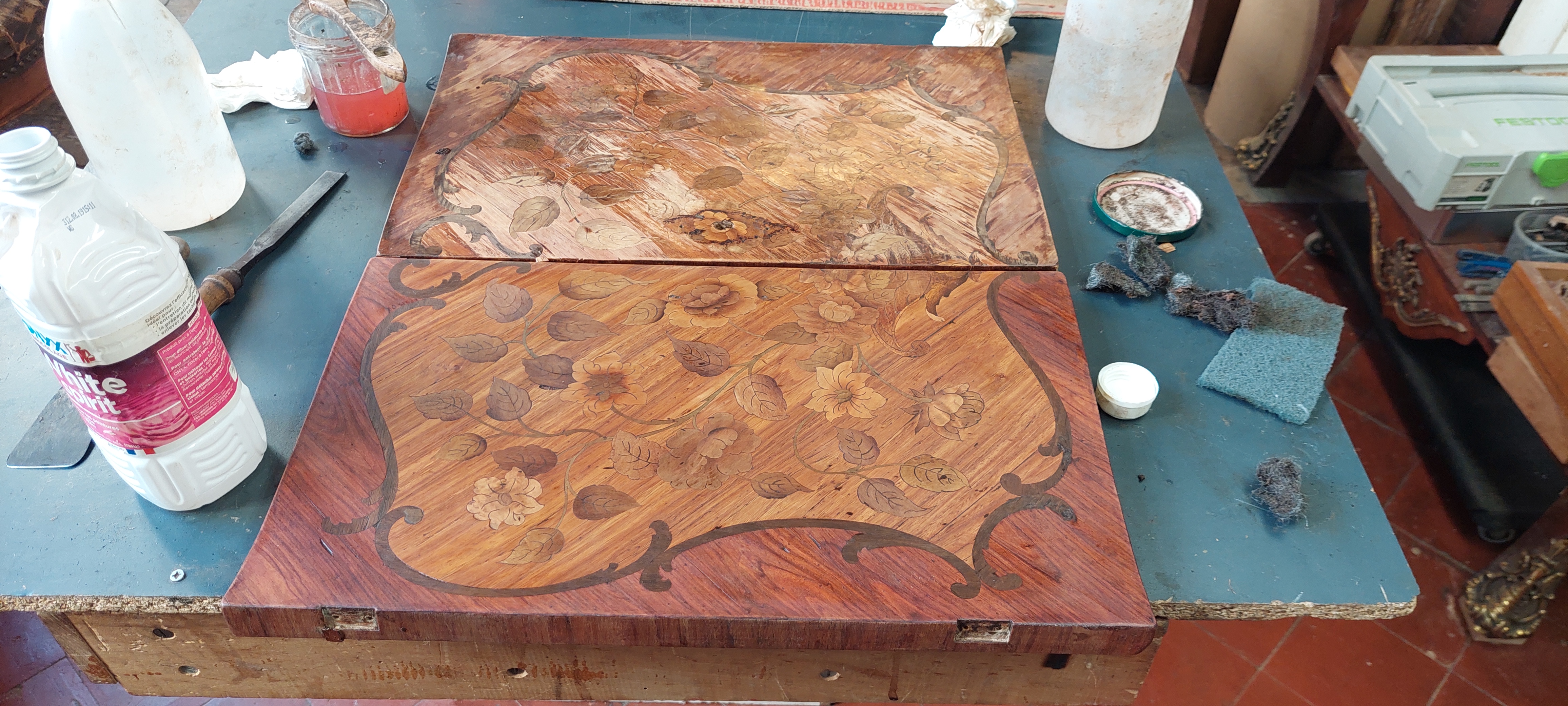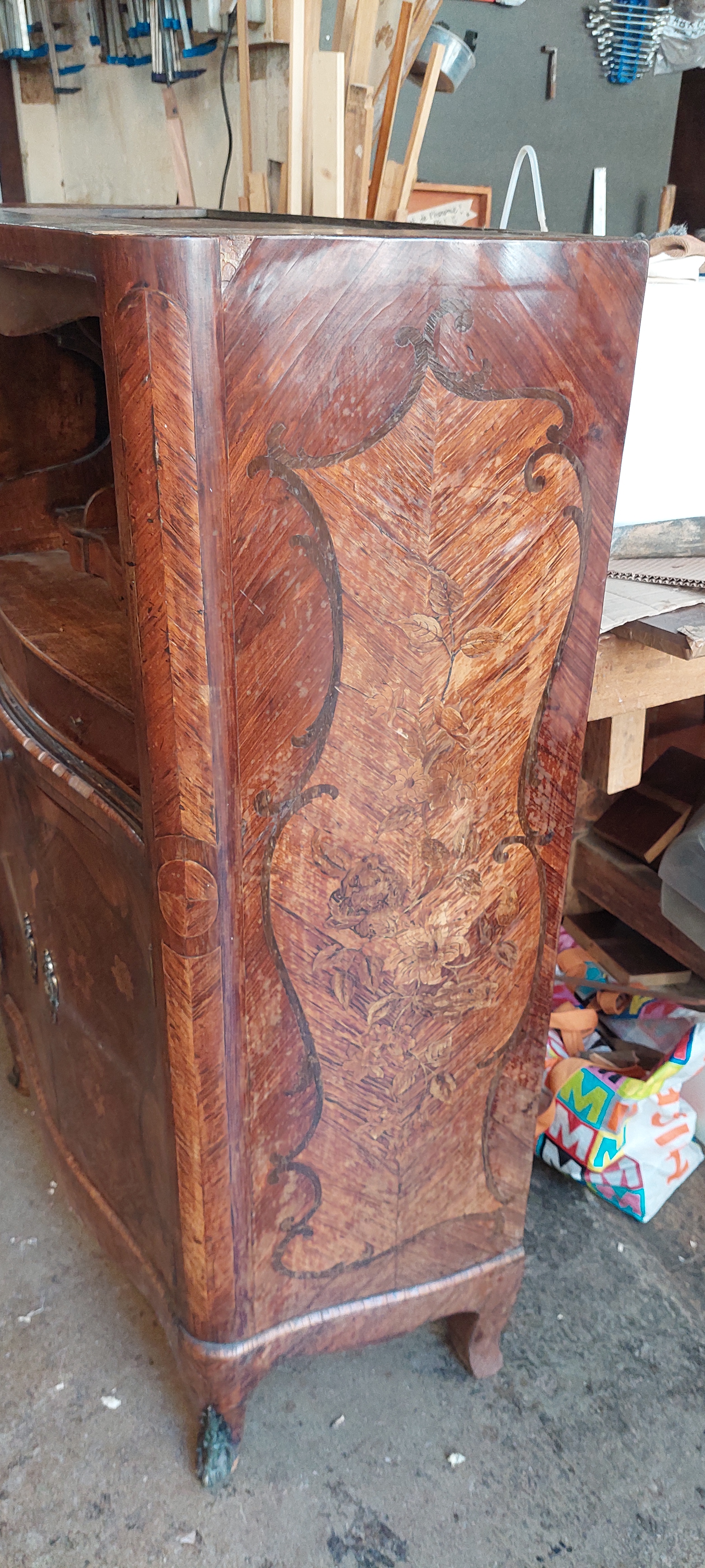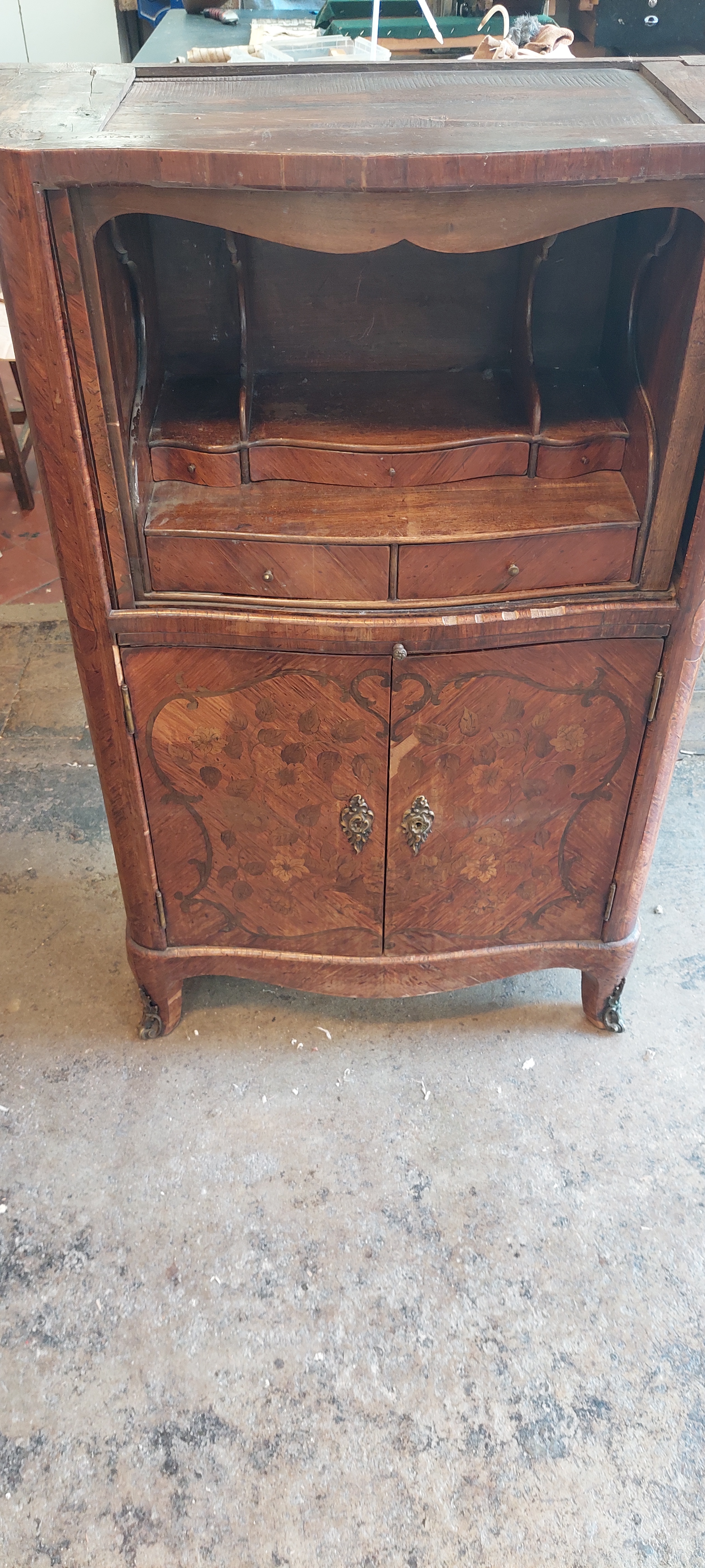 Le secrétaire déjà bien fatigué a été fracturé au niveau du rideau qui est explosé en plusieurs morceaux, le vernis est passé, le placage insolé et il est difficile d’en lire la marqueterie. La colle a cristallisé et se détache en de nombreux endroits entrainant la chute du placage dont il manque certaines parties (quelques morceaux ont été récupérés).