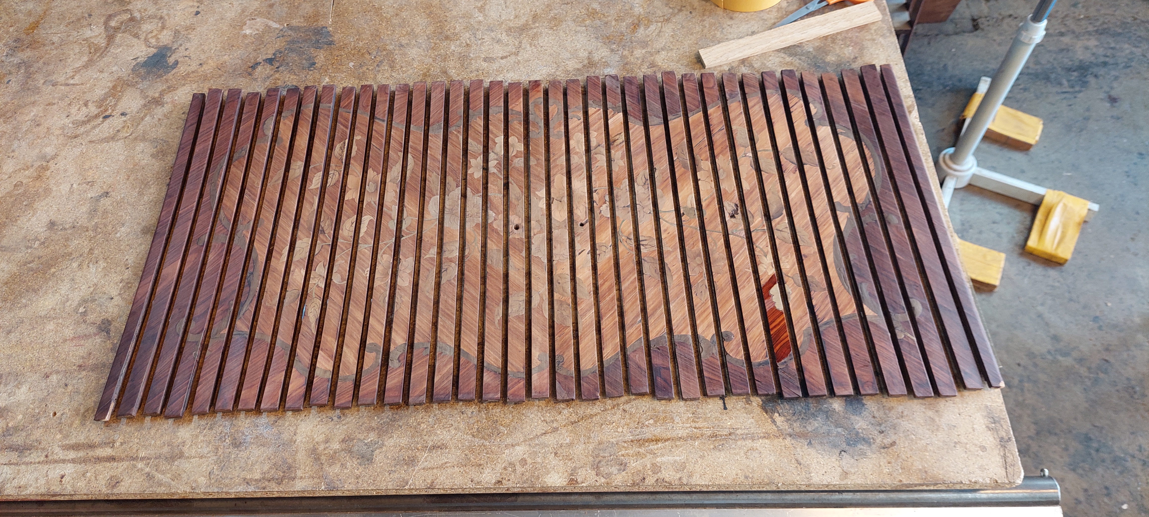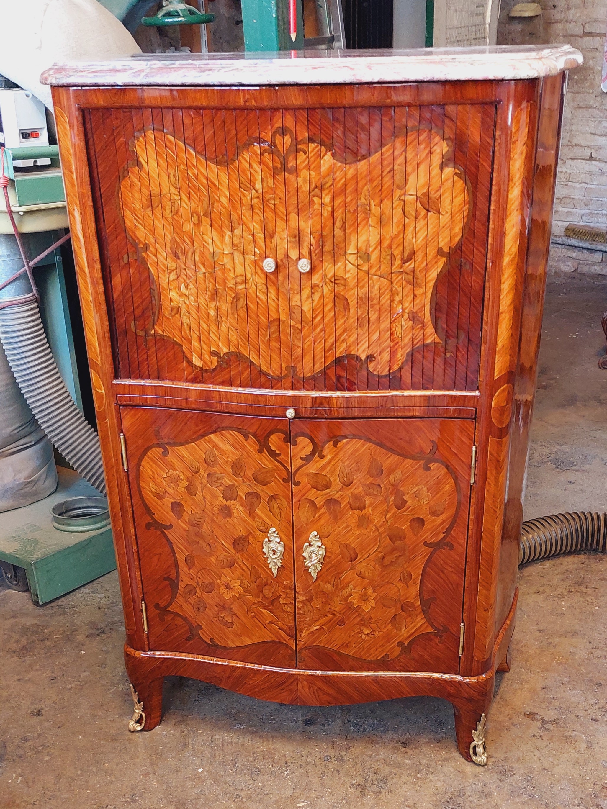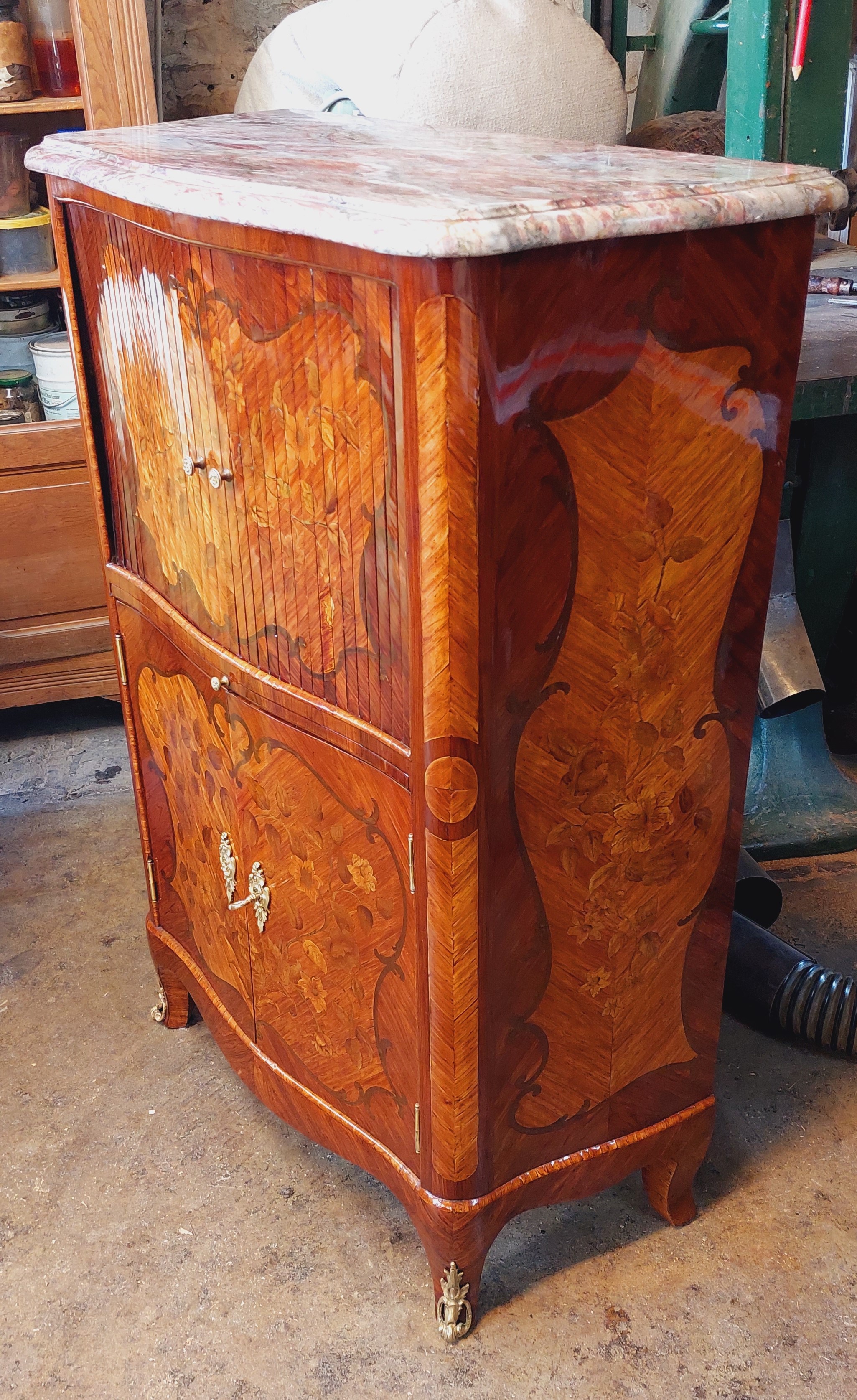 Restauration d’un secrétaire de milieu a rideaux de la fin du XIXe estampillé « HJ Alivertti » en marqueterie de fleur sur fond de bois de rose et bois de violette. Fabrication à l’ancienne avec du placage scié.