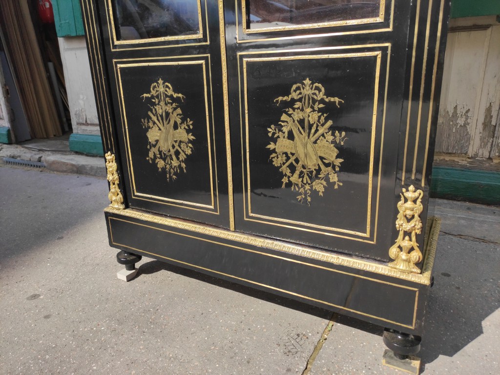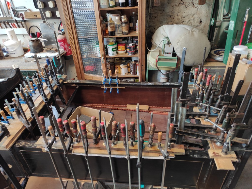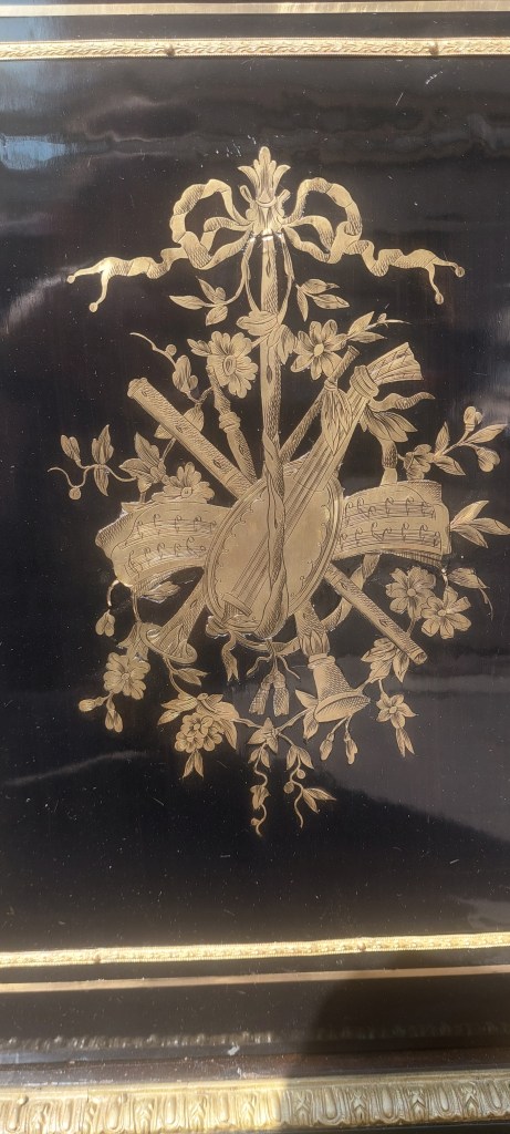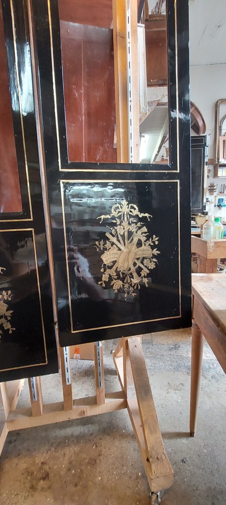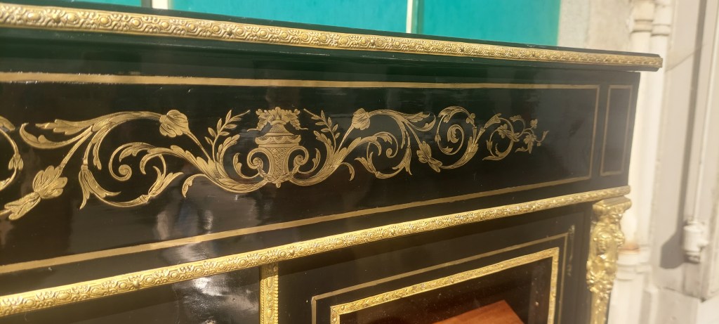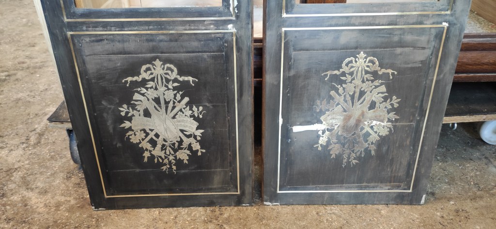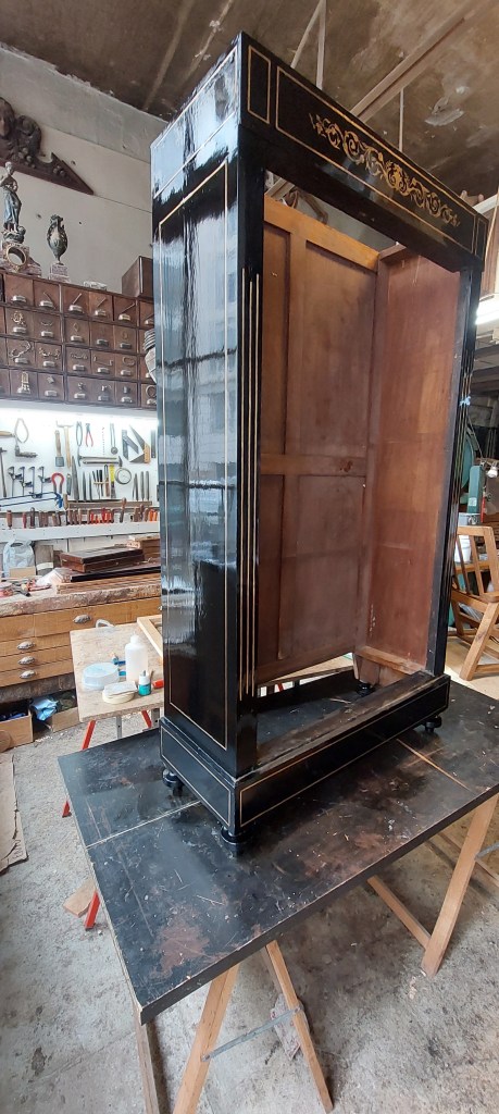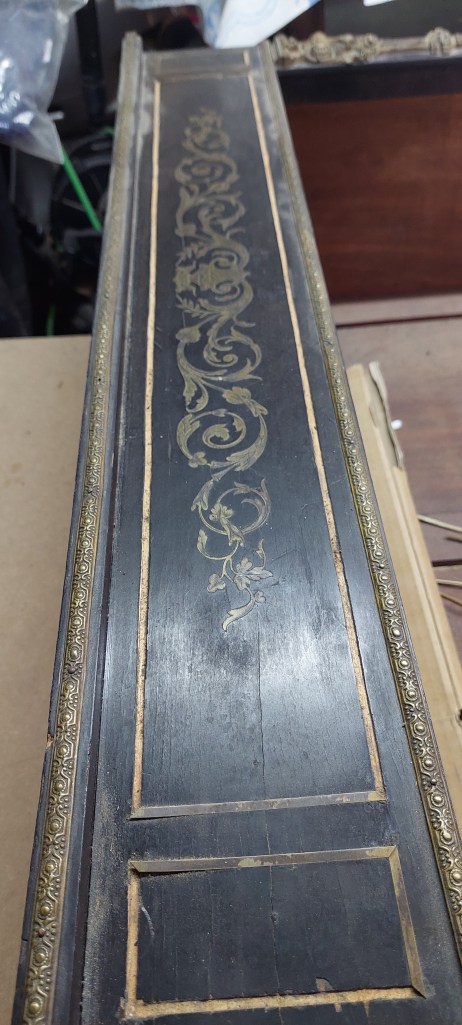 Après dépose des bronzes, recollage de toutes les parties décollées, stabilisation et rebouchage des fissures, ajustage des parties trop longues, gros travail de remplacement des filet manquants. Décapage, mise au noir, polissage pour désoxyder les laitons et retrouver la finesse des gravures puis vernis au tampon pour retrouver tout l’éclat d’origine. Nettoyage des bronzes présent, remplacement de ceux manquants, puis remontage avec quincaillerie en laiton.
