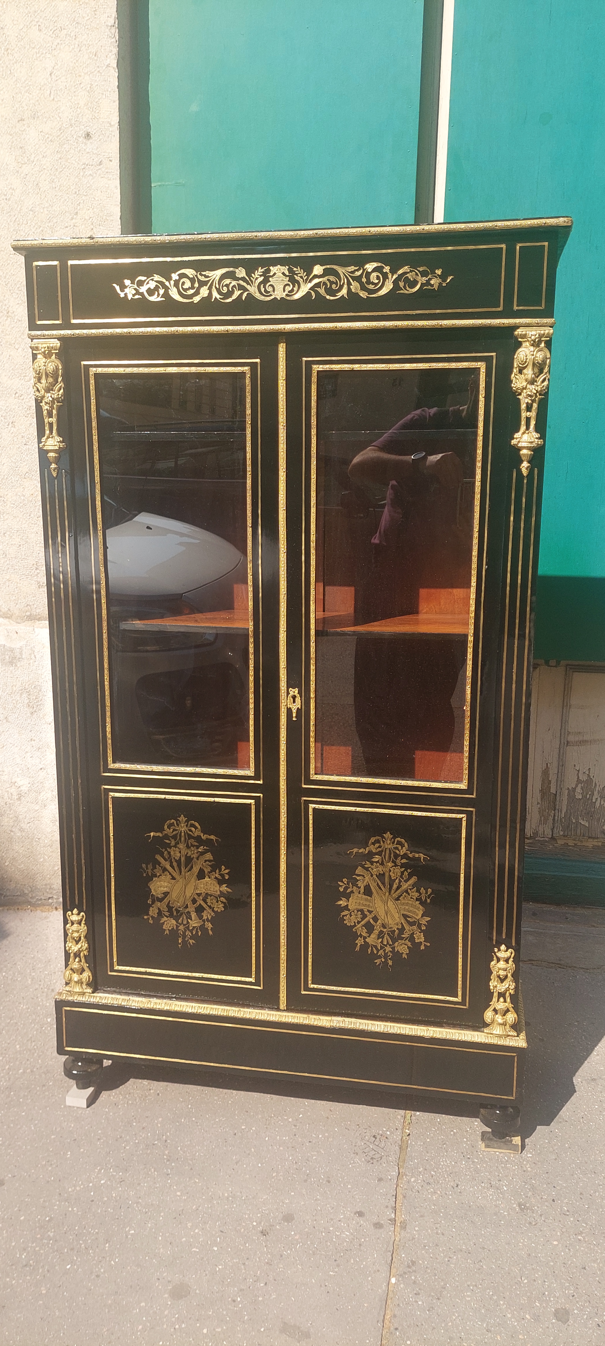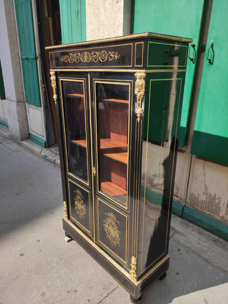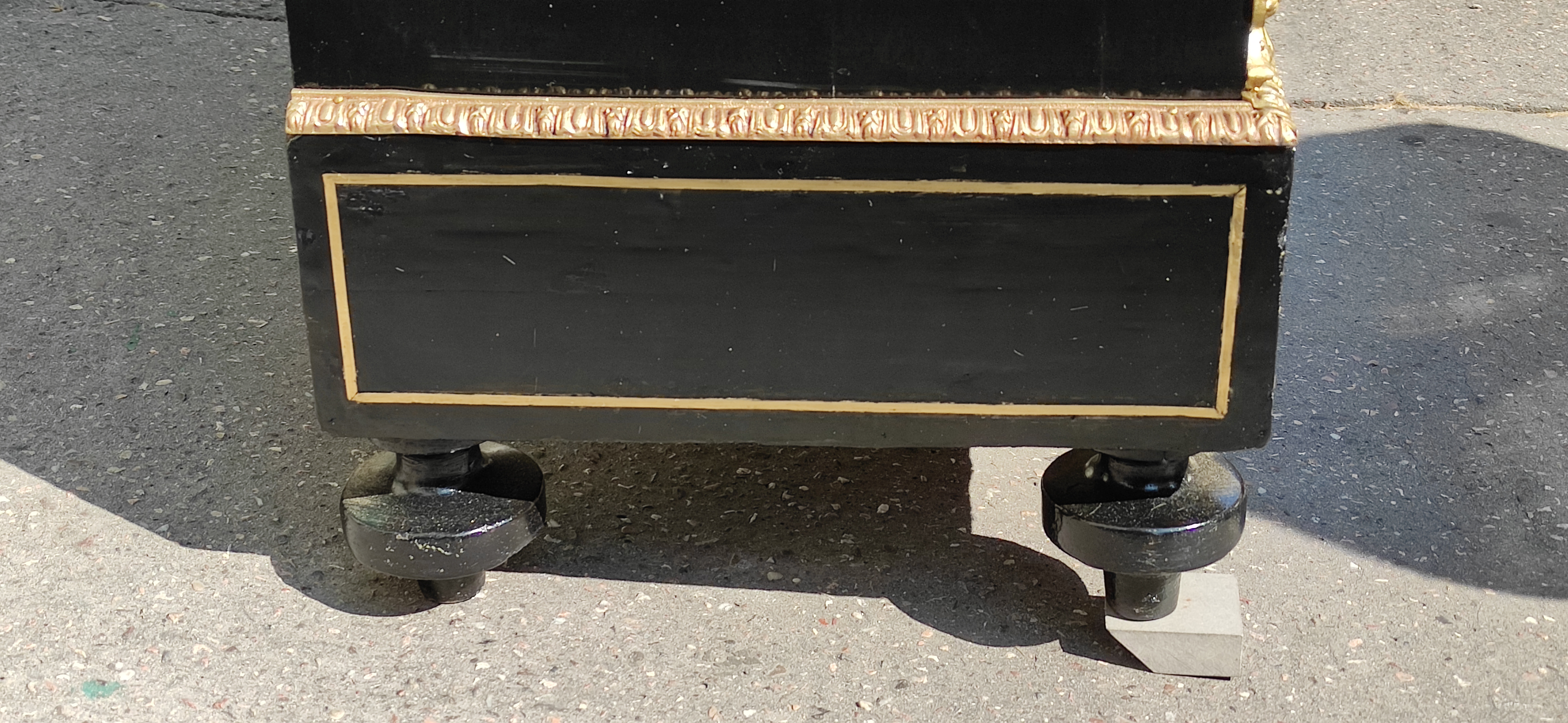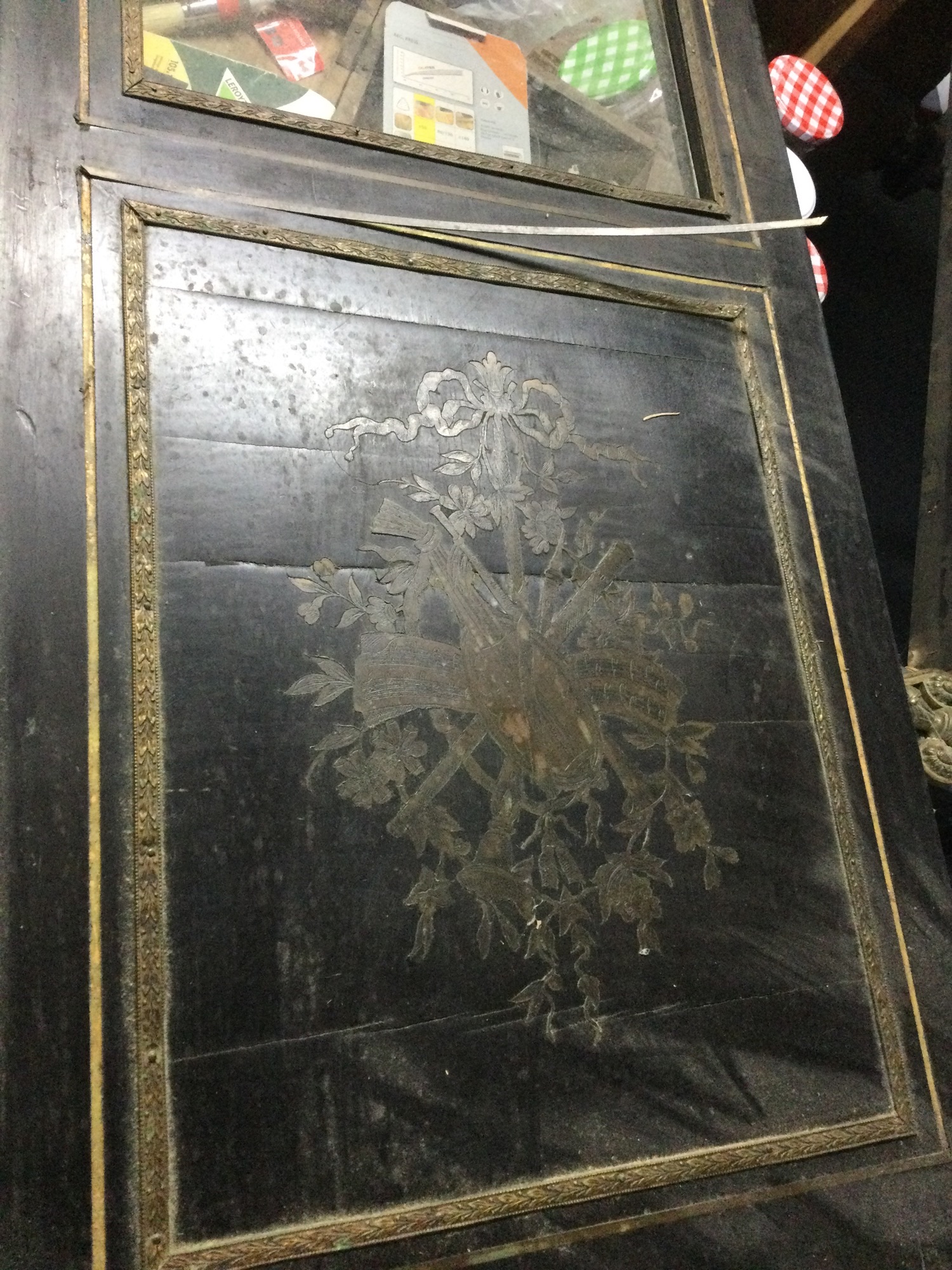 Après dépose des bronzes, recollage de toutes les parties décollées, stabilisation et rebouchage des fissures, ajustage des parties trop longues, gros travail de remplacement des filet manquants. Décapage, mise au noir, polissage pour désoxyder les laitons et retrouver la finesse des gravures puis vernis au tampon pour retrouver tout l’éclat d’origine. Nettoyage des bronzes présent, remplacement de ceux manquants, puis remontage avec quincaillerie en laiton.