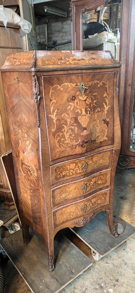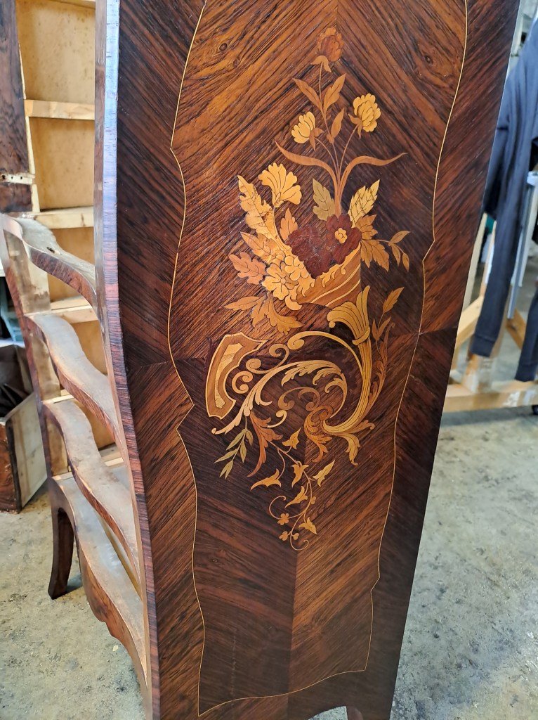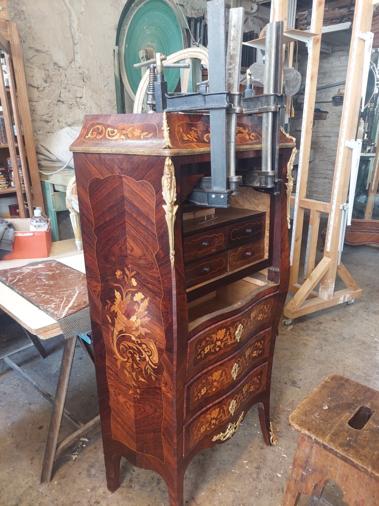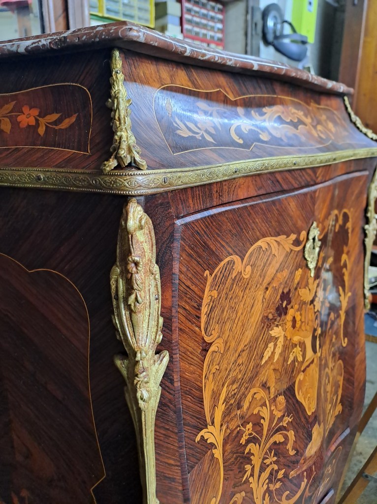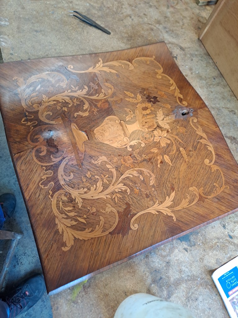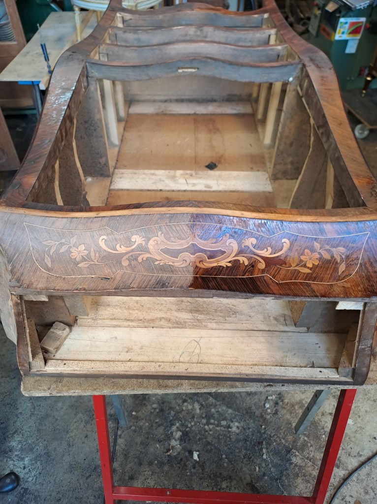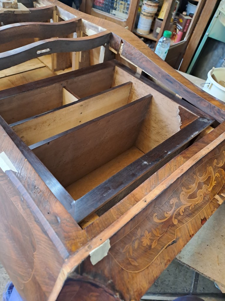 Pas de difficultés particulière lors de sa restauration, à noter cependant le choix de la finition « Polie-huilée » qui a permis de faire ressortir les couleurs sans poncer ni user le placage en place.