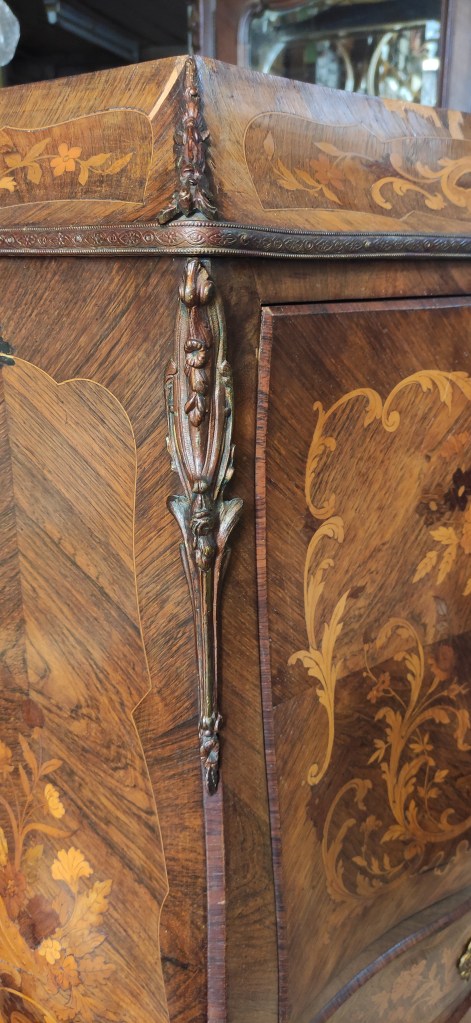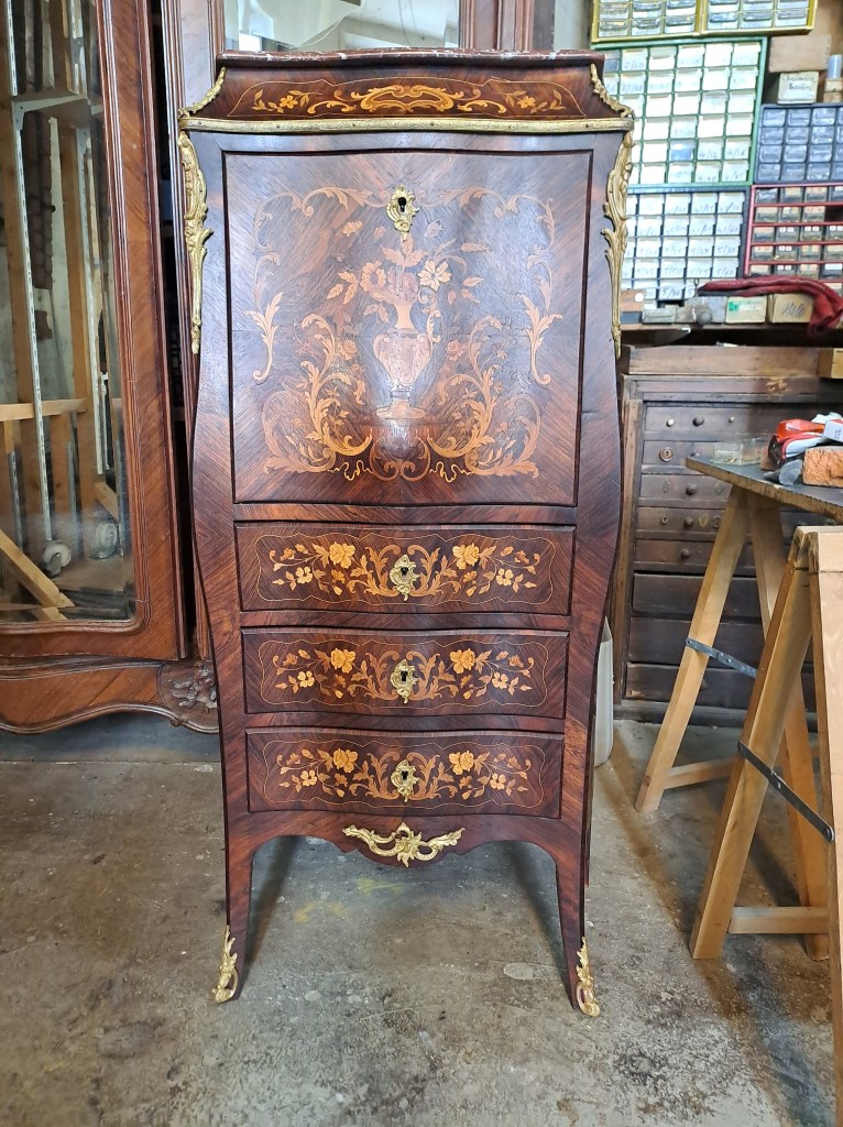 Le nôtre est fortement insolé et les bronzes ont été recouvert d’une patine rouge s’apparentant plus à un barbouillage de peinture qu’autre chose, le laissant dans un état plutôt « fadasse ». Quelques manques de placage et un marbre rouge belge fendu (dont nous n’avons malheureusement pris aucune photo) complètent le tableau. Vous remarquerez le galbe extrêmement particulier sur les cotés et l’abattant, typique du style Napoléon III