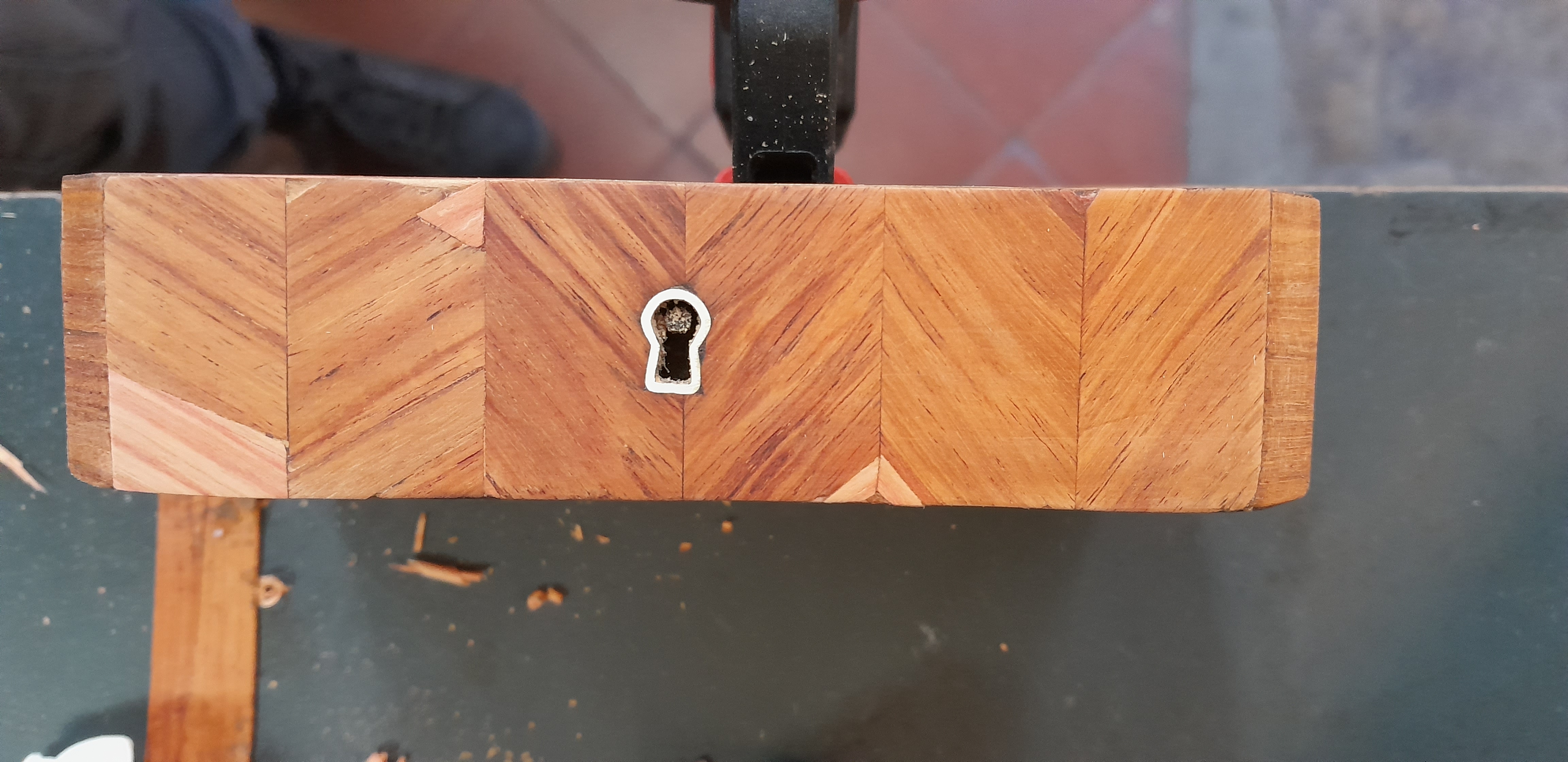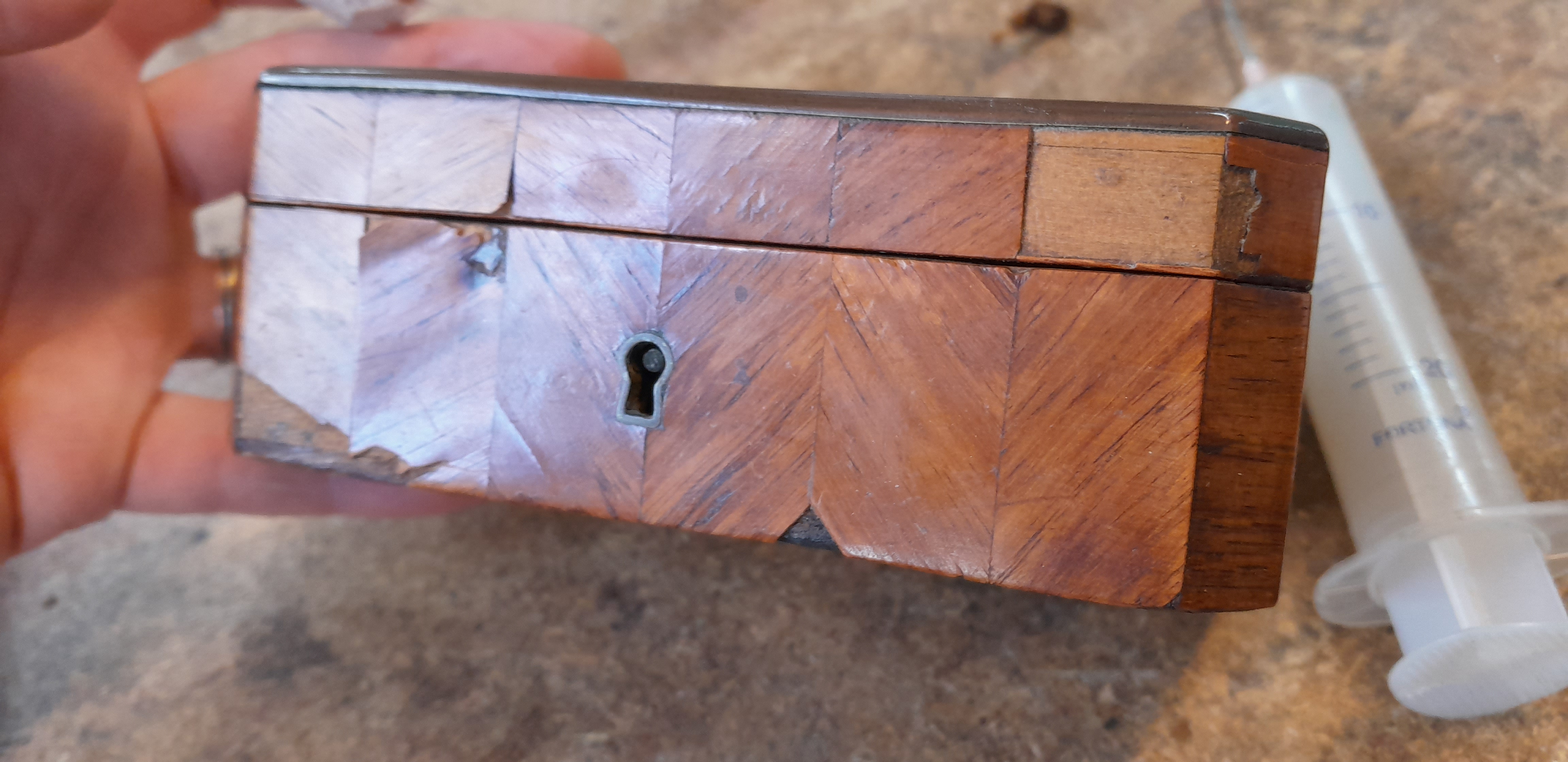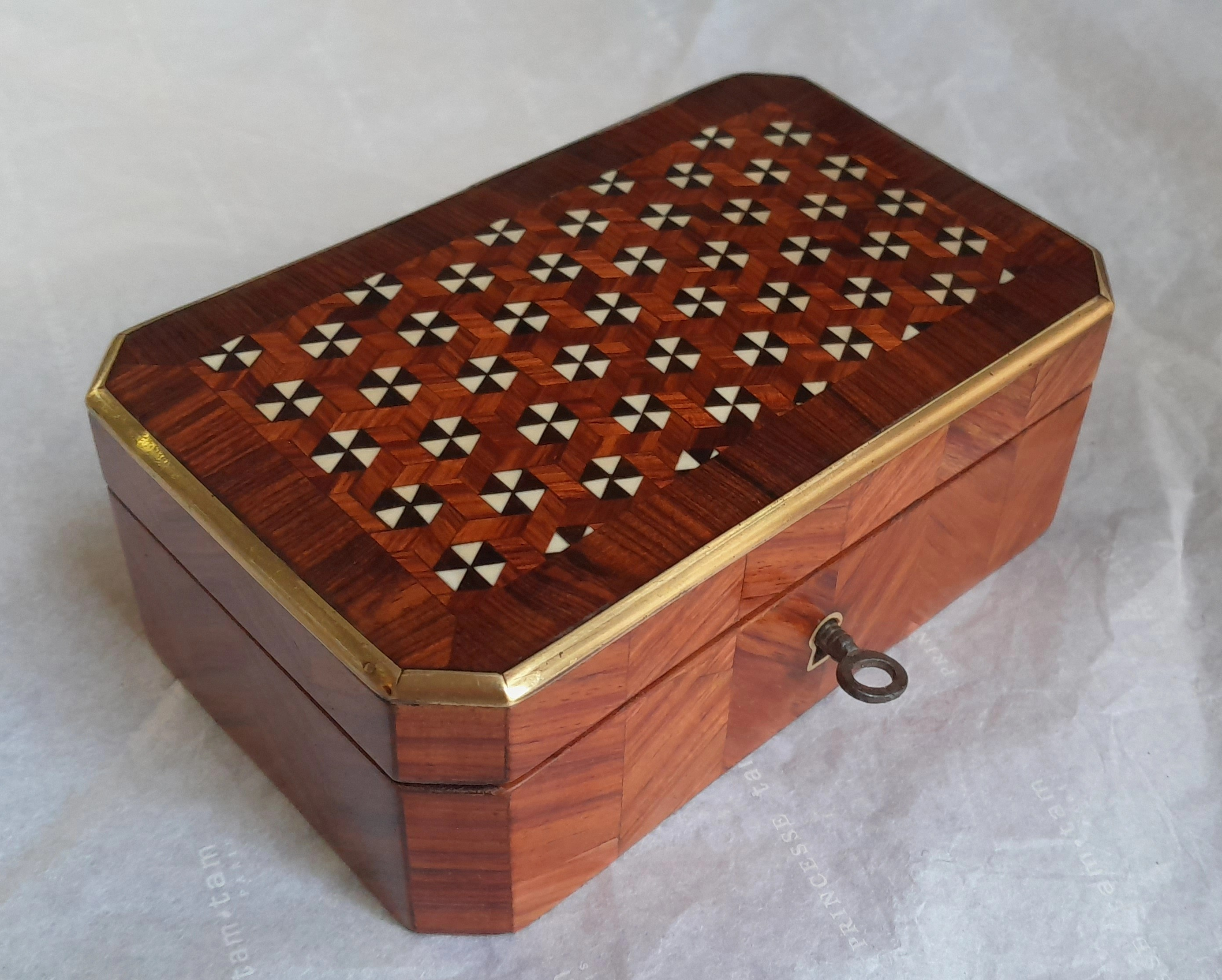 Une ravissante petite boite Napoléon III nous a été confié : dépose de toutes les parties décollées, remplacement des parties manquantes et correction des réparation précédentes (frisage en chevron notamment), recollage et ajustement des laitons, décapage, mise en teinte puis finition vernis Roubo (voir l’article du C2RMF). Fourniture et ajustement d’une clef. Gainage intérieur avec soierie rouge…..