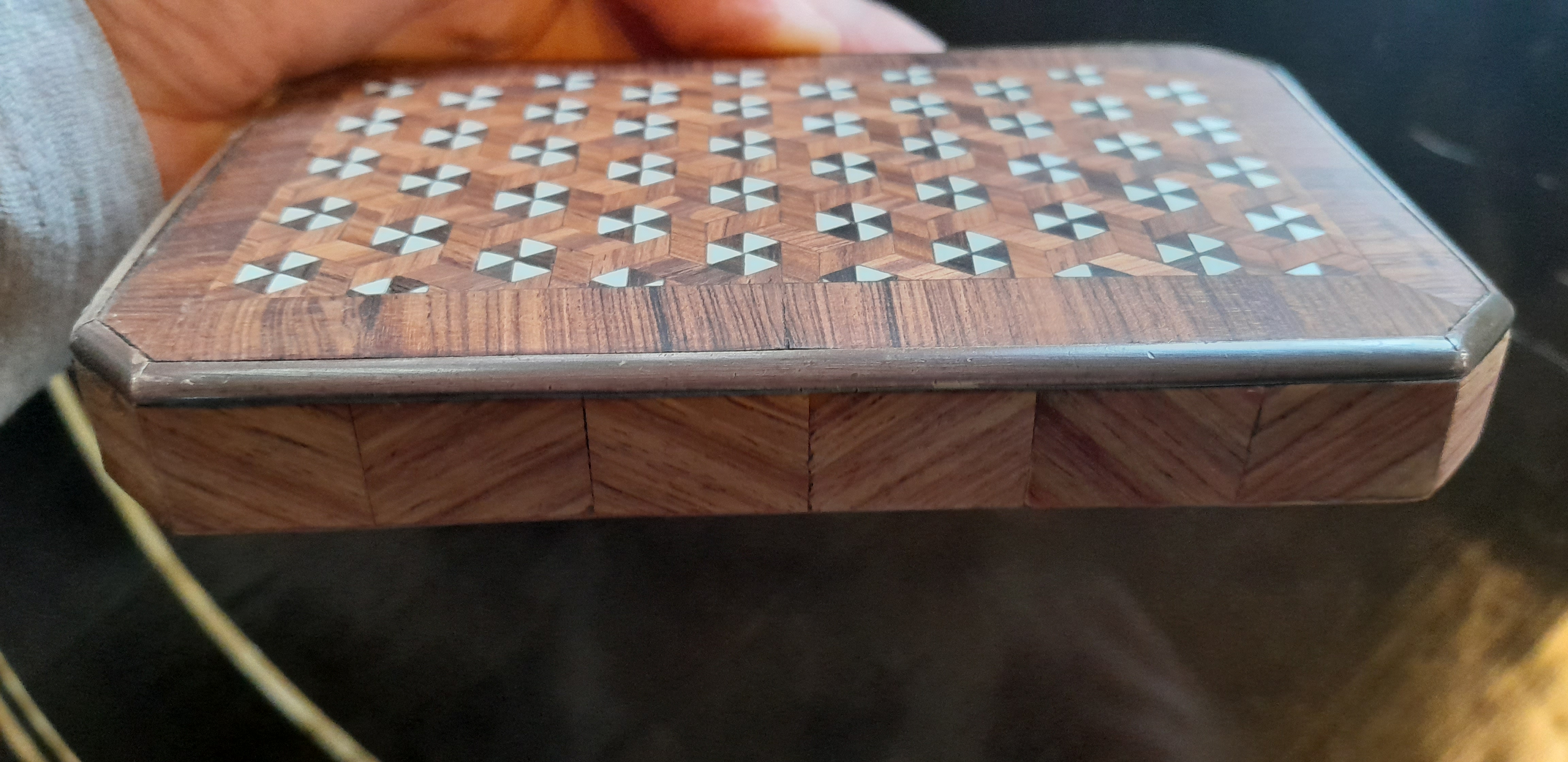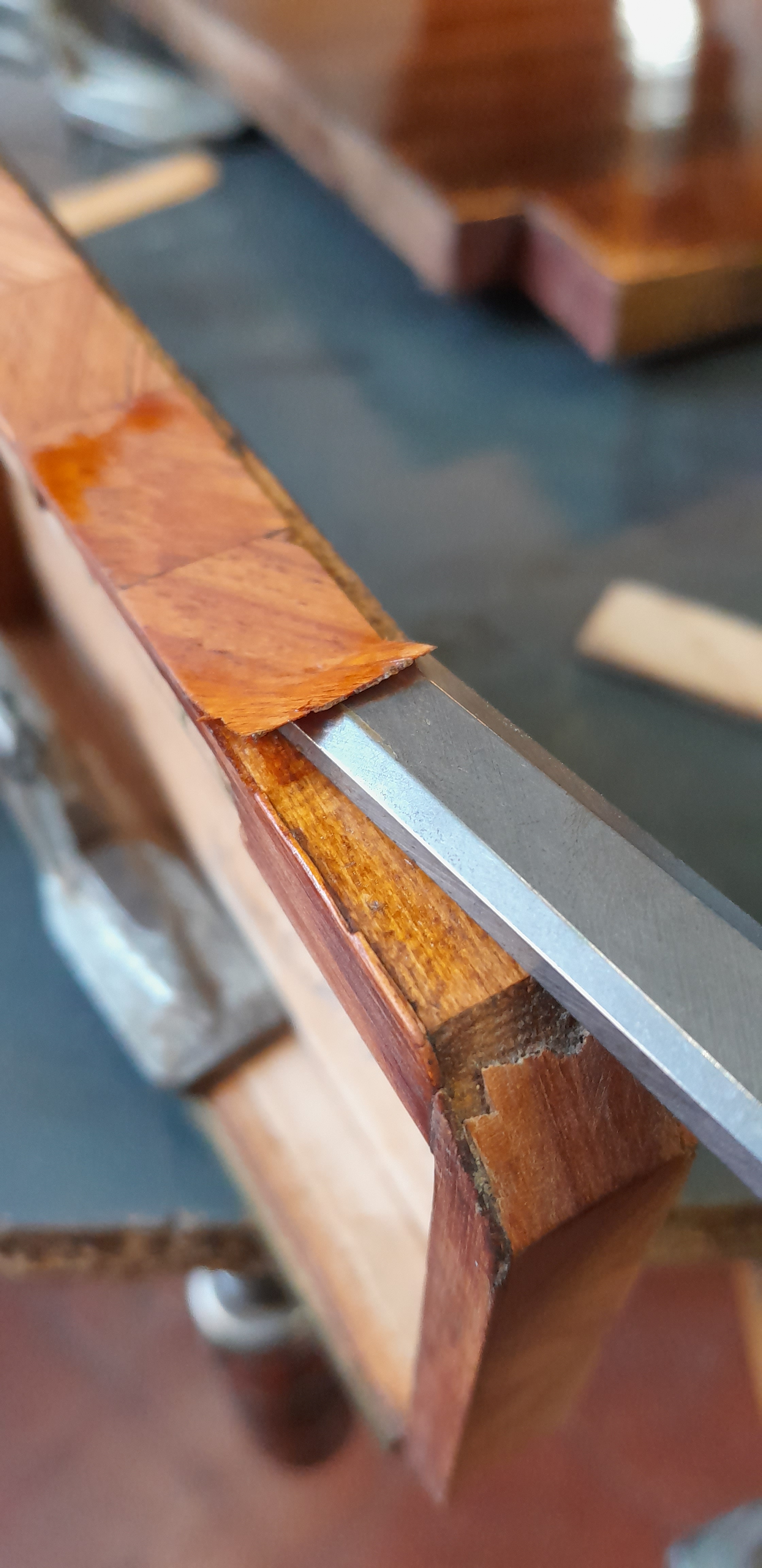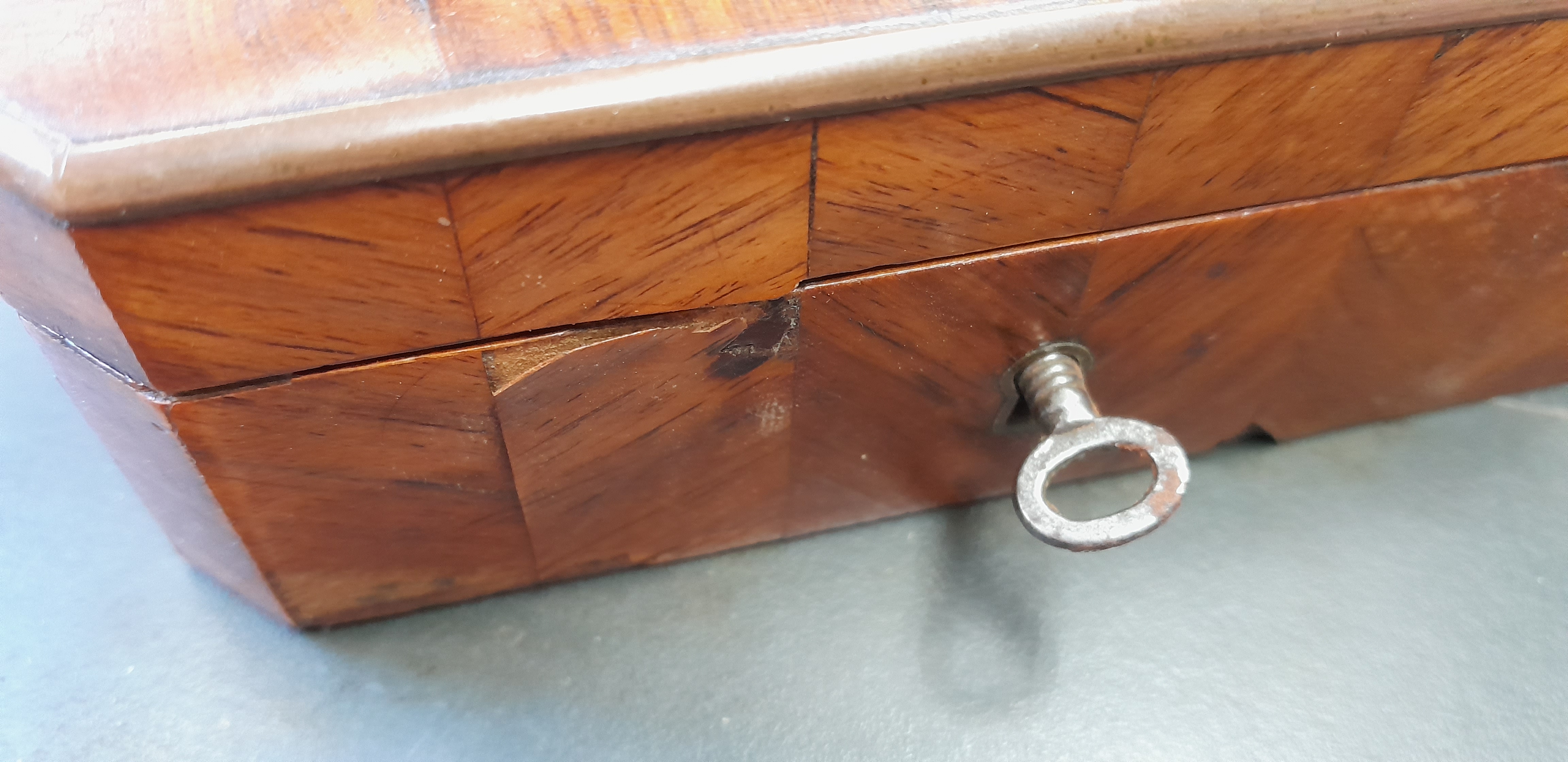 Une ravissante petite boite Napoléon III nous a été confié : dépose de toutes les parties décollées, remplacement des parties manquantes et correction des réparation précédentes (frisage en chevron notamment), recollage et ajustement des laitons, décapage, mise en teinte puis finition vernis Roubo (voir l’article du C2RMF). Fourniture et ajustement d’une clef. Gainage intérieur avec soierie rouge…..